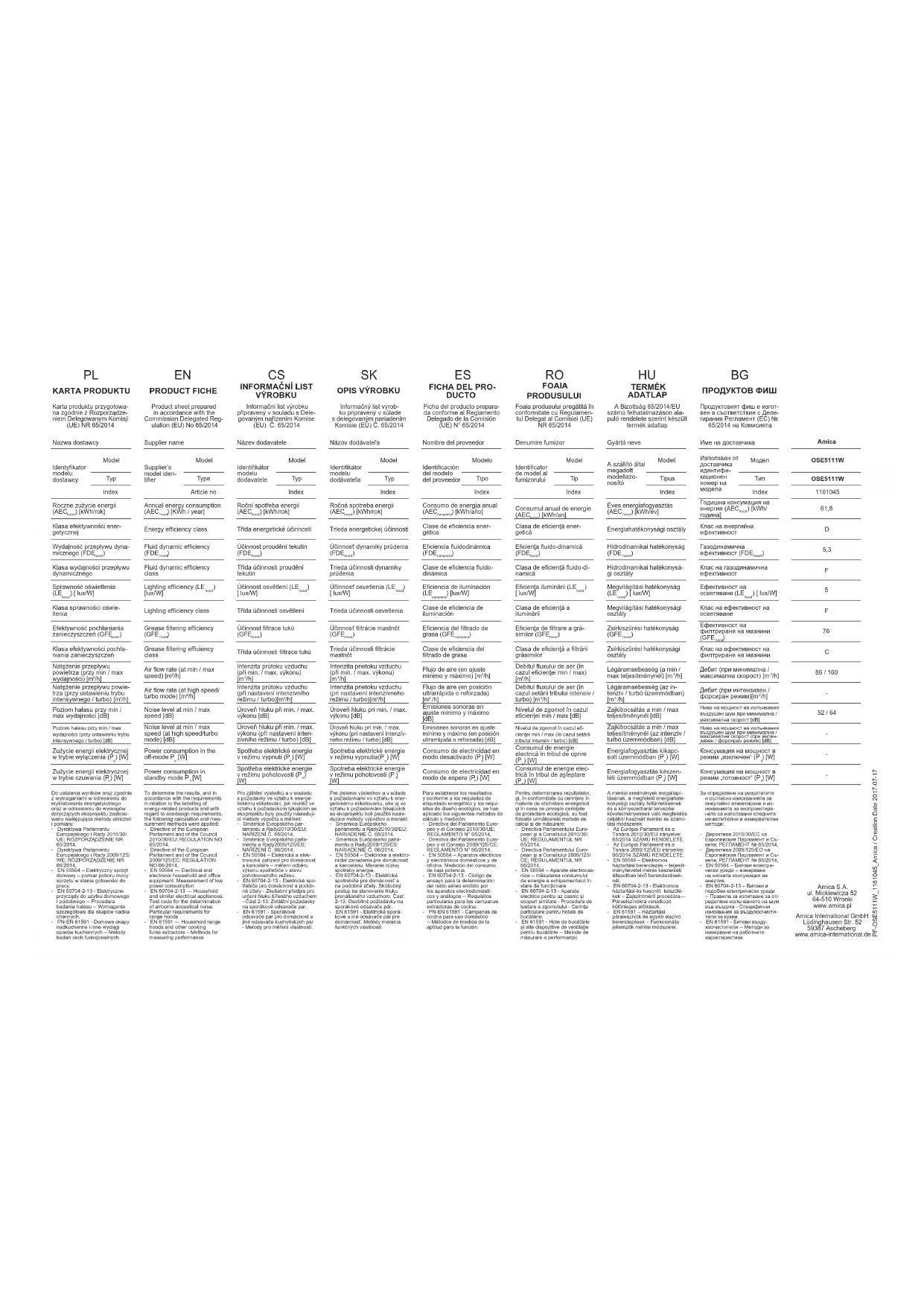 ) [W] Carte du produit préparée conformément au Règlement Délégué (UE) Nº 65/2014 de la Commission Conformément aux exigences quand à l’étiquetage énergétique et par rapport aux exigences concernant les éco-projets les méthodes de calcul et de mesure suivantes ont été appliquées pour établir les résultats : - Directive du Parlement Européen et de la Commission 2010/30/UE ; REGLEMENT Nº 65/2014, - Directive du Parlement Européen et de la Commission 2009/125/ CE ; REGLEMENT Nº 66/2014, - EN 50564 – Equipement élec- trique domestique – mesure de la consommation en énergie en état de disposition au travail. - EN 60704-2-13 – Appareils électriques à utilité domestique et similaires -- Procédure de mesure de la puissance acoustique – Exigences particulières pour les hottes. - EN 61591 – Hottes domestiques et autres extracteurs de vapeurs de cuisine – Méthodes de tests des traits fonctionnels. FR NL DA SV PRODUCTKAART Naam van de leverancier Typeaan- duiding van het model van de leve- rancier Model Type Index Het jaarlijkse energieverbru- ik (AEC afzuigkap ) [kWh/rok] Energie-efciëntieklasse De hydrodynamische efciëntie (FDE afzuigkap