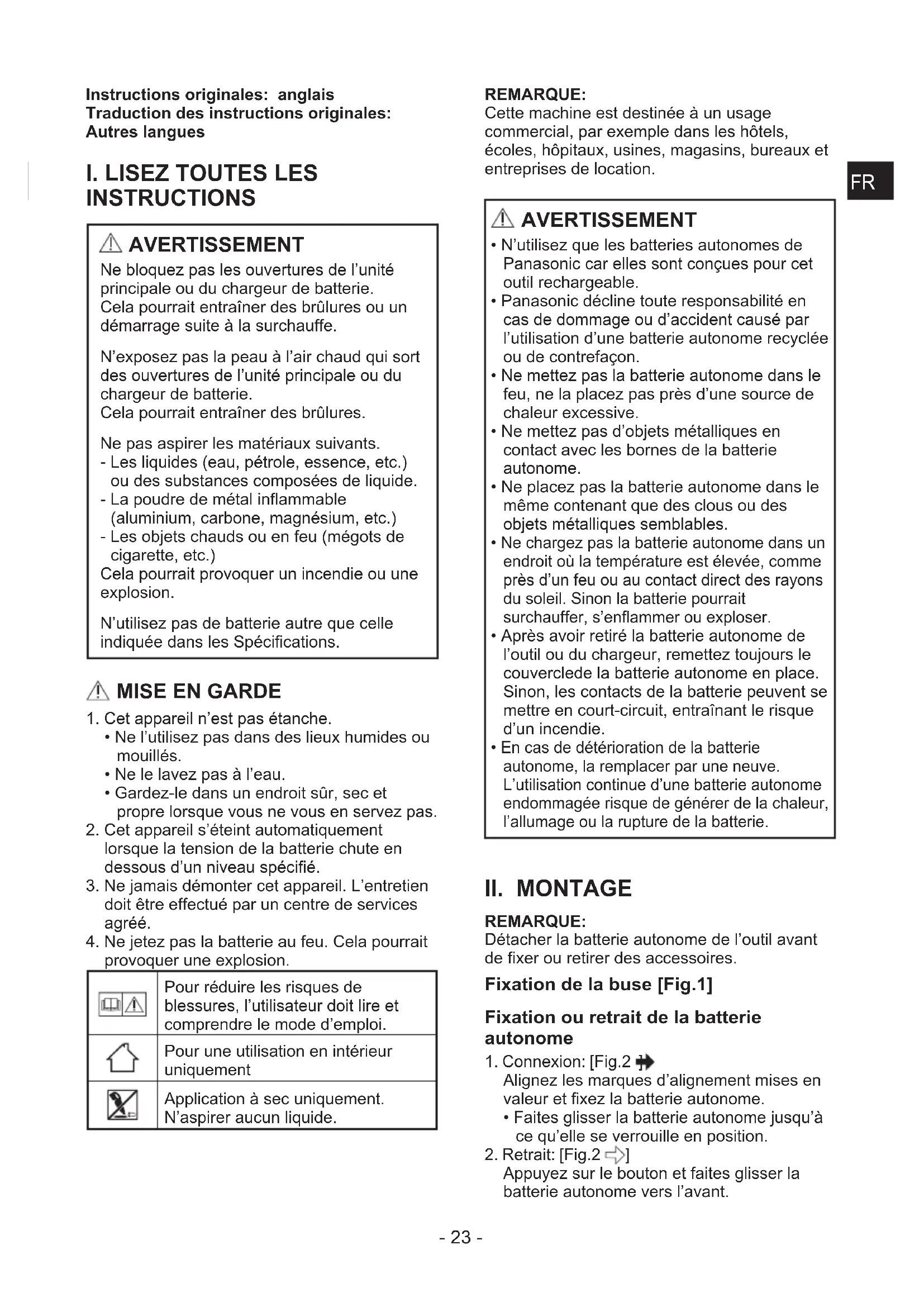 INSTRUCTIONS AVERTISSEMENT Ne bloquez pas les ouvertures de l’unité principale ou du chargeur de batterie. Cela pourrait entraîner des brûlures ou un démarrage suite à la surchauffe. N’exposez pas la peau à l’air chaud qui sort des ouvertures de l’unité principale ou du chargeur de batterie. Cela pourrait entraîner des brûlures. Ne pas aspirer les matériaux suivants. - Les liquides (eau, pétrole, essence, etc.) ou des substances composées de liquide. - La poudre de métal inflammable (aluminium, carbone, magnésium, etc.) - Les objets chauds ou en feu (mégots de cigarette, etc.) Cela pourrait provoquer un incendie ou une explosion. N’utilisez pas de batterie autre que celle indiquée dans les Spécifications.