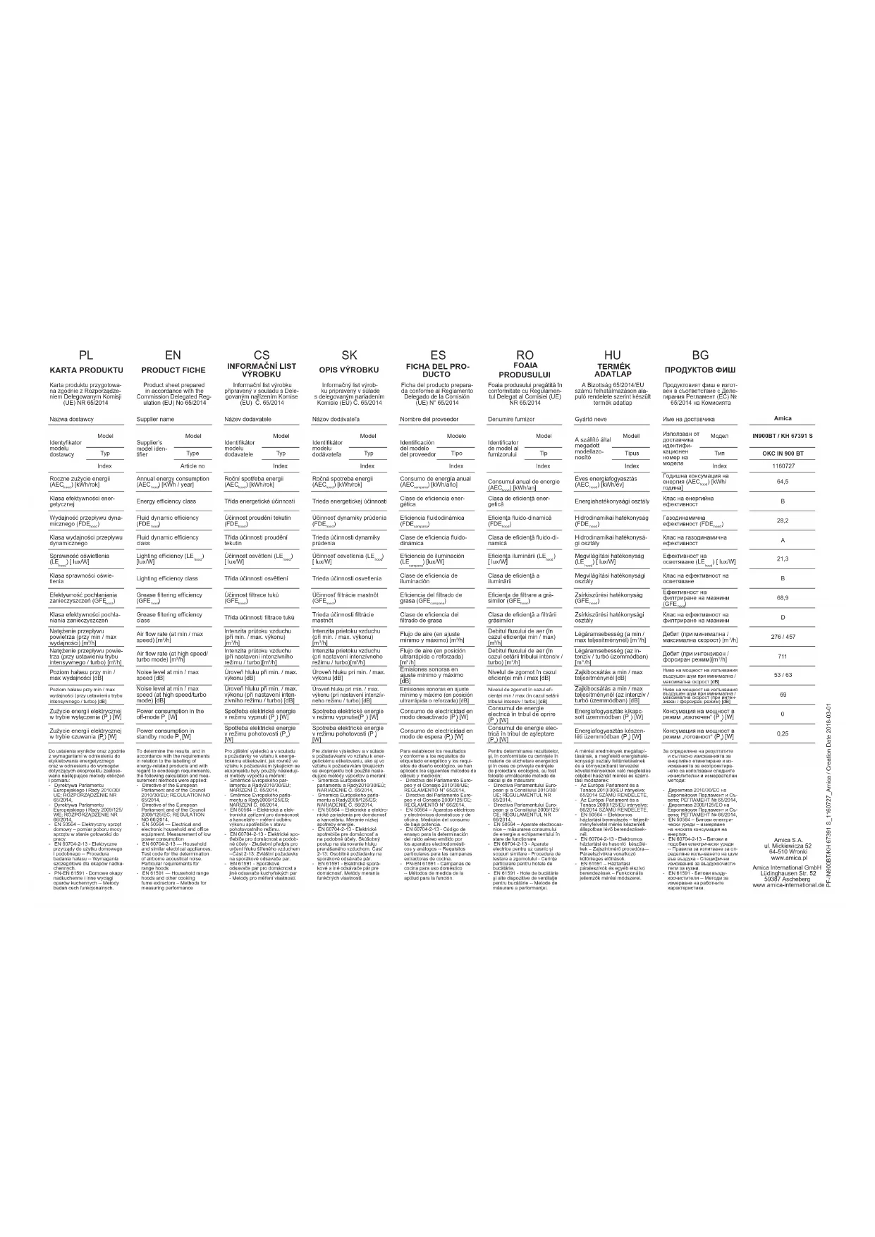) [W] Carte du produit préparée conformément au Règlement Délégué (UE) Nº 65/2014 de la Commission Conformément aux exigences quand à l’étiquetage énergétique et par rapport aux exigences concernant les éco-projets les méthodes de calcul et de mesure suivantes ont été appliquées pour établir les résultats : - Directive du Parlement Européen et de la Commission 2010/30/UE ; REGLEMENT Nº 65/2014, - Directive du Parlement Européen et de la Commission 2009/125/ CE ; REGLEMENT Nº 66/2014, - EN 50564 – Equipement élec- trique domestique – mesure de la consommation en énergie en état de disposition au travail. - EN 60704-2-13 – Appareils électriques à utilité domestique et similaires -- Procédure de mesure de la puissance acoustique – Exigences particulières pour les hottes. - EN 61591 – Hottes domestiques et autres extracteurs de vapeurs de cuisine – Méthodes de tests des traits fonctionnels. FR NL DA SV PRODUCTKAART Naam van de leverancier Typeaan- duiding van het model van de leve- rancier Model Type Index Het jaarlijkse energieverbru- ik (AEC afzuigkap ) [kWh/rok] Energie-eciëntieklasse De hydrodynamische eciëntie (FDE afzuigkap