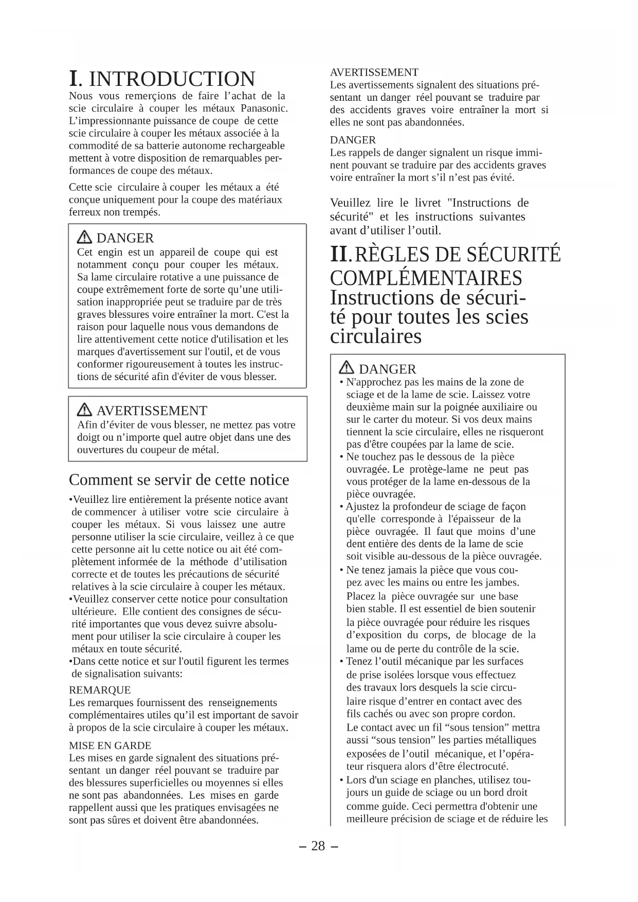 Nous vous remerçions de faire l’achat de la scie circulaire à couper les métaux Panasonic. L’impressionnante puissance de coupe de cette scie circulaire à couper les métaux associée à la commodité de sa batterie autonome rechargeable mettent à votre disposition de remarquables per-formances de coupe des métaux.Cette scie circulaire à couper les métaux a été conçue uniquement pour la coupe des matériaux ferreux non trempés. DANGER Cet engin est un appareil de coupe qui est notamment conçu pour couper les métaux. Sa lame circulaire rotative a une puissance de coupe extrêmement forte de sorte qu’une utili-sation inappropriée peut se traduire par de très graves blessures voire entraîner la mort. C'est la raison pour laquelle nous vous demandons de lire attentivement cette notice d'utilisation et les marques d'avertissement sur l'outil, et de vous conformer rigoureusement à toutes les instruc-tions de sécurité afin d'éviter de vous blesser. AVERTISSEMENT Afin d’éviter de vous blesser, ne mettez pas votre doigt ou n’importe quel autre objet dans une des ouvertures du coupeur de métal. Comment se servir de cette notice