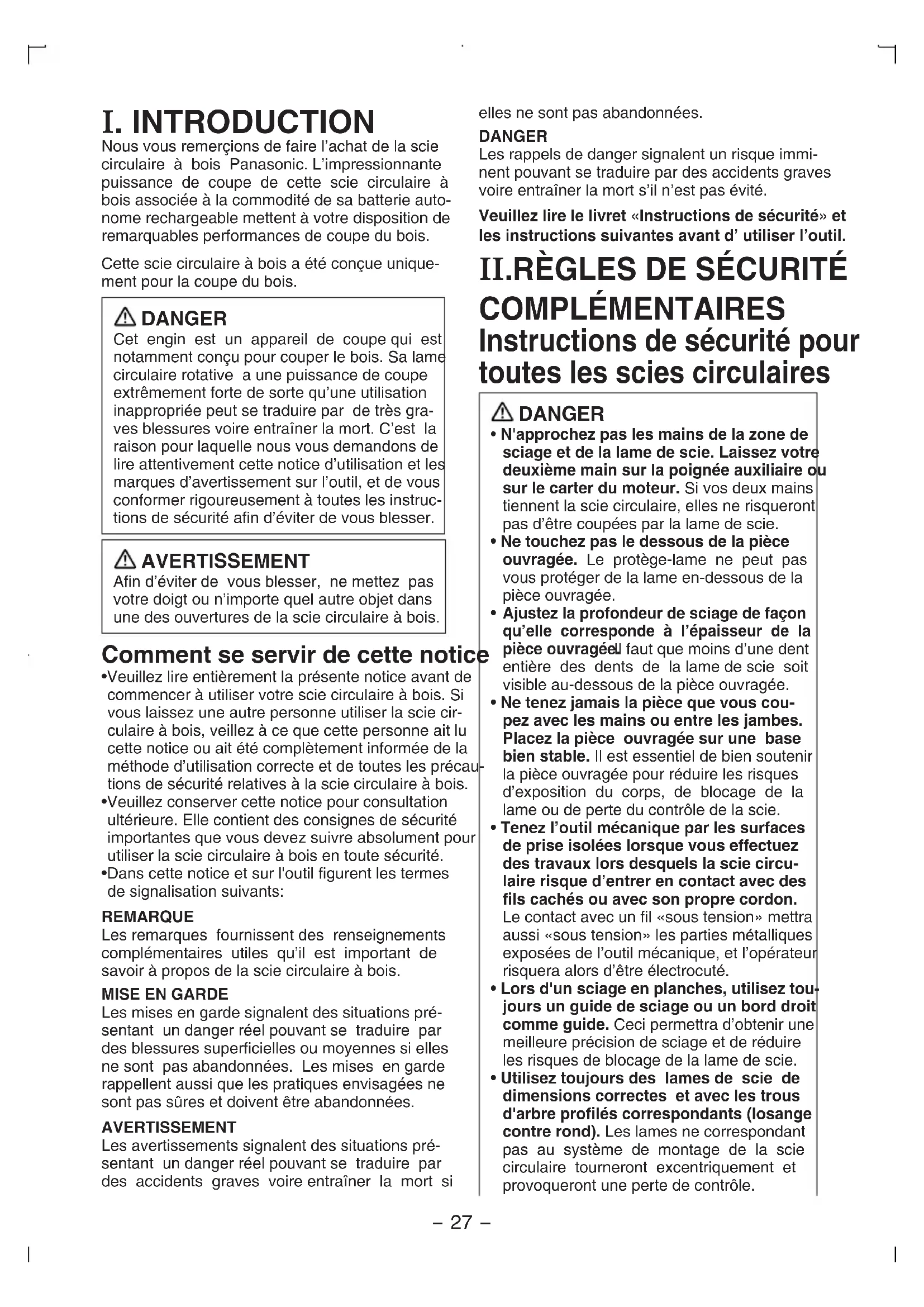 Nous vous remerçions de faire l’achat de la scie circulaire à bois Panasonic. L’impressionnante puissance de coupe de cette scie circulaire à bois associée à la commodité de sa batterie auto- nome rechargeable mettent à votre disposition de remarquables performances de coupe du bois. Cette scie circulaire à bois a été conçue unique- ment pour la coupe du bois. DANGER Cet engin est un appareil de coupe qui est notamment conçu pour couper le bois. Sa lame circulaire rotative a une puissance de coupe extrêmement forte de sorte qu’une utilisation inappropriée peut se traduire par de très gra- ves blessures voire entraîner la mort. C’est la raison pour laquelle nous vous demandons de lire attentivement cette notice d’utilisation et les marques d’avertissement sur l’outil, et de vous conformer rigoureusement à toutes les instruc- tions de sécurité afin d’éviter de vous blesser. AVERTISSEMENT Afin d’éviter de vous blesser, ne mettez pas votre doigt ou n’importe quel autre objet dans une des ouvertures de la scie circulaire à bois. Comment se servir de cette notice