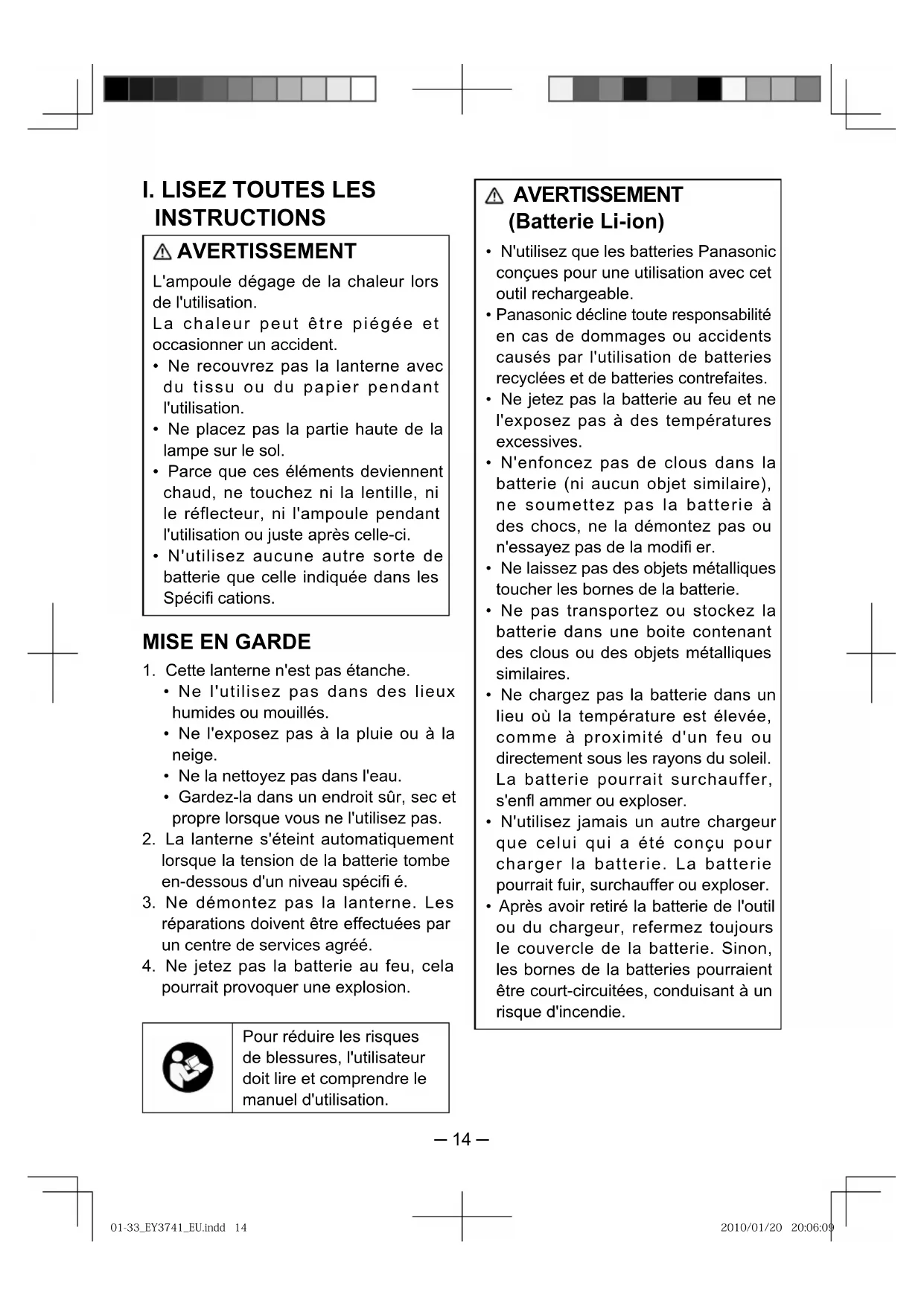 Modèle EY3741 intensité lumineuse lampe fl uorescente Environ 330 lux (avec réfl ecteur), mesurée à partir de l'avant à environ 40 cm de la source lumineuse LED Environ 25 lux (avec réfl ecteur), mesurée à partir de l'avant à environ 40 cm de la source lumineuse Taille Environ 99 (largeur) x 124 (profondeur) x 298 (hauteur) mm (Hors batterie; avec poignée en position verticale) Poids Environ 450 g (sans la batterie) Batterie EY9L40 EY9L41 EY9L42 Tension de la batterie 14,4 V DC 01-33EY3741EU.indd1801-33EY3741EU.indd18 2010/01/2020:06:122010/01/2020:06:12─ 19 ─
