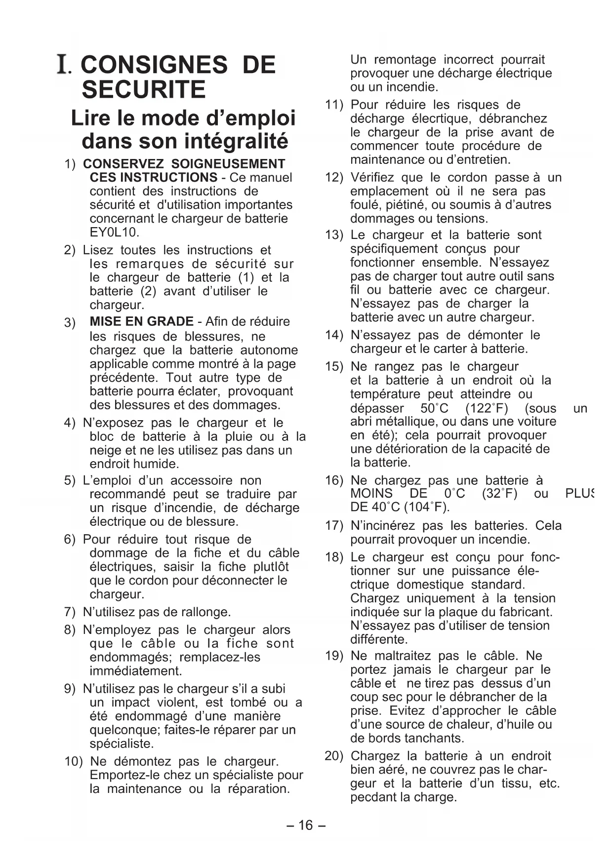 16) Ne chargez pas une batterie à