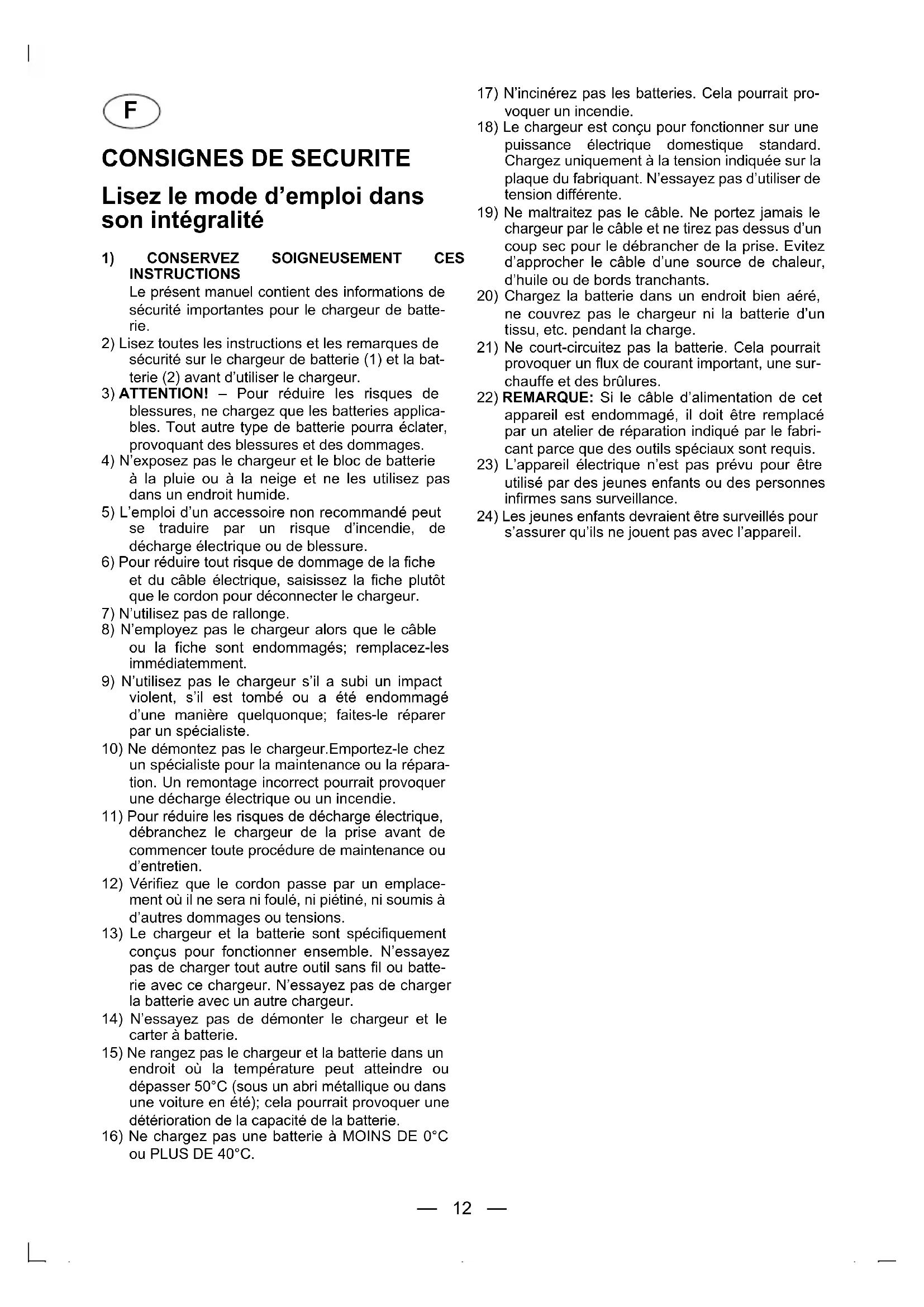 INSTRUCTIONS Le présent manuel contient des informations de sécurité importantes pour le chargeur de batte- rie.