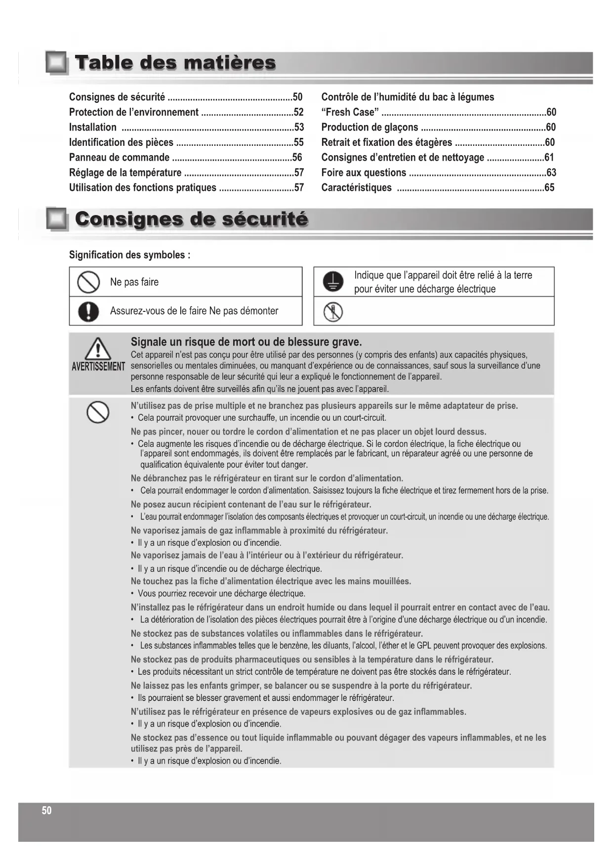 Toegestane omgevingstemperatuur: 10 °C tot 43 °C Wanneer de deuren volledig geopend zijn 600 mm644 mm1249 mm1199 mm687 mm650 mm max. 90°5050 Table des matières Signication des symboles : Ne pas faire Indique que l’appareil doit être relié à la terre pour éviter une décharge électrique Assurez-vous de le faire Ne pas démonter AVERTISSEMENT Signale un risque de mort ou de blessure grave. Cet appareil n’est pas conçu pour être utilisé par des personnes (y compris des enfants) aux capacités physiques, sensorielles ou mentales diminuées, ou manquant d’expérience ou de connaissances, sauf sous la surveillance d’une personne responsable de leur sécurité qui leur a expliqué le fonctionnement de l’appareil. Les enfants doivent être surveillés an qu’ils ne jouent pas avec l’appareil. N’utilisez pas de prise multiple et ne branchez pas plusieurs appareils sur le même adaptateur de prise.