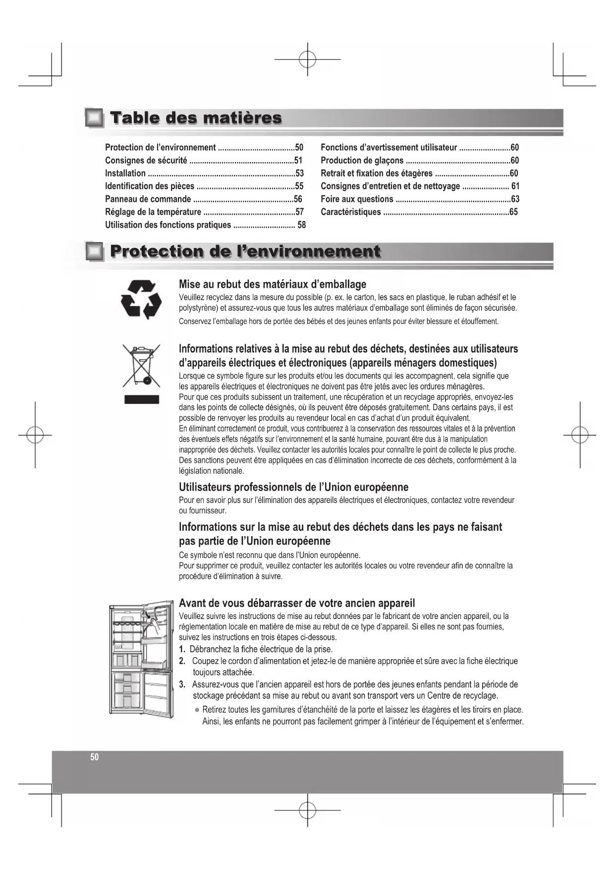 - Retirez toutes les garnitures d’étanchéité de la porte et laissez les étagères et les tiroirs en place. Ainsi, les enfants ne pourront pas facilement grimper à l’intérieur de l’équipement et s’enfermer. Protection de l’environnement Table des matières Protection de l’environnement p. 50