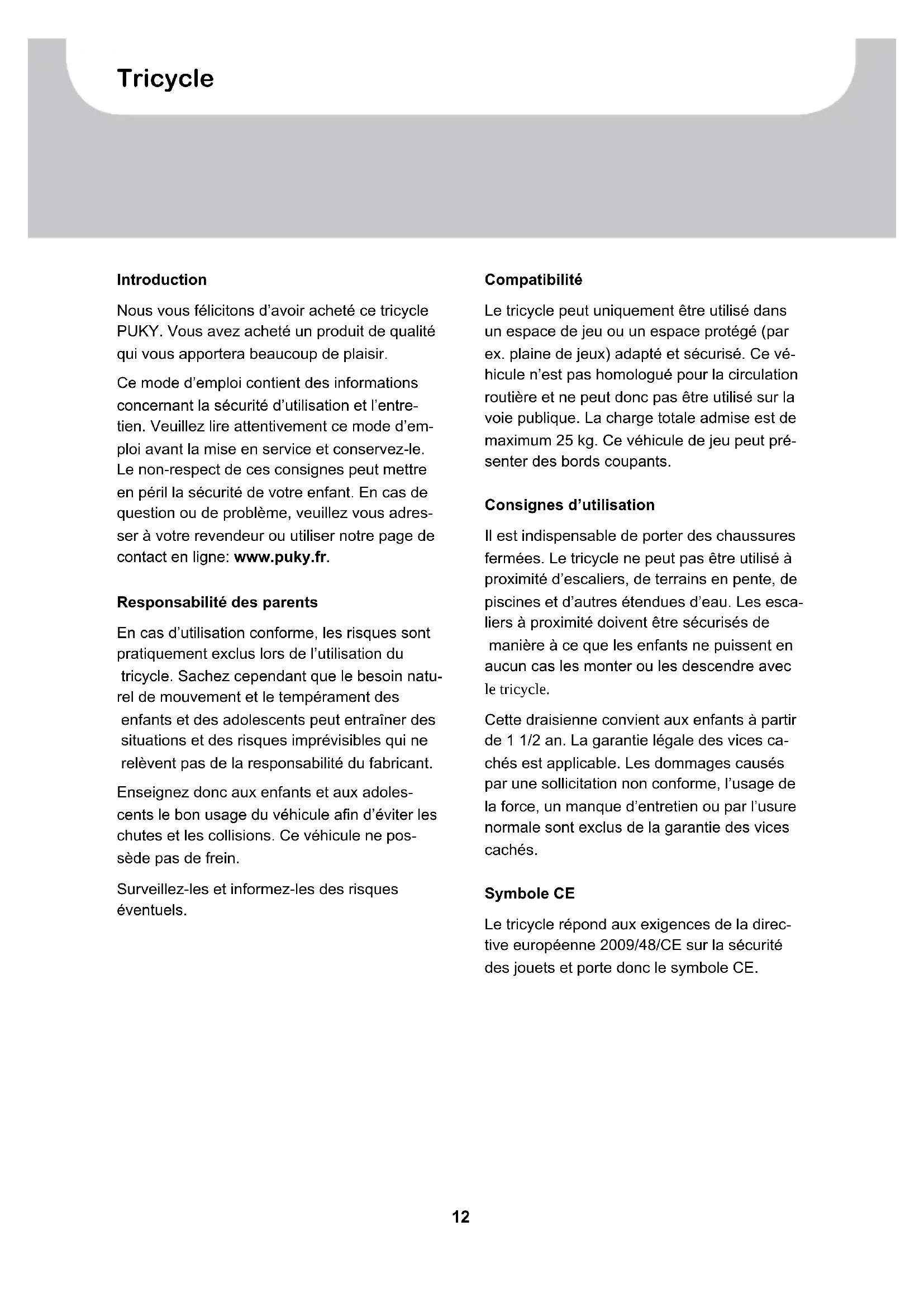 Ce mode d'emploi contient des informations concernant la sécurité d'utilisation et l'entretien. Veuillez lore attentivement ce mode d'emploi avant la mise en service et conservez-le. Le non-respect de ces consignes peutmettre en peril la sécurité de votre enfant. En cas de question ou de probleme, veuillez vous adresser àvoitrévendeur ou utiliser notre page de contact en ligne: www.puky.fr.