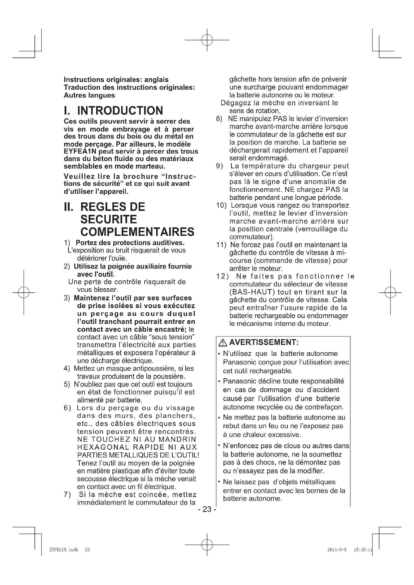 EYFEA1N - Perceuse visseuse sans fil PANASONIC - Notice d'utilisation et mode d'emploi gratuit