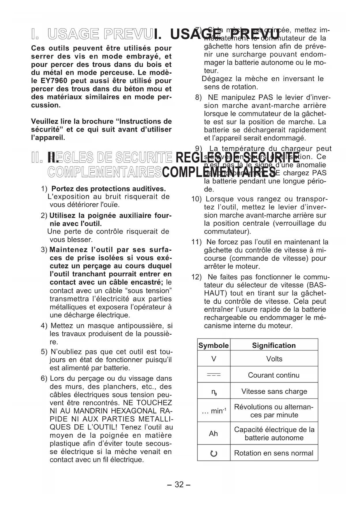 tateur du sélecteur de vitesse (BAS- HAUT) tout en tirant sur la gâchet- te du contrôle de vitesse. Cela peut entraîner l’usure rapide de la batterie rechargeable ou endommager le mé- canisme interne du moteur. Symbole Signification V Volts Courant continu
