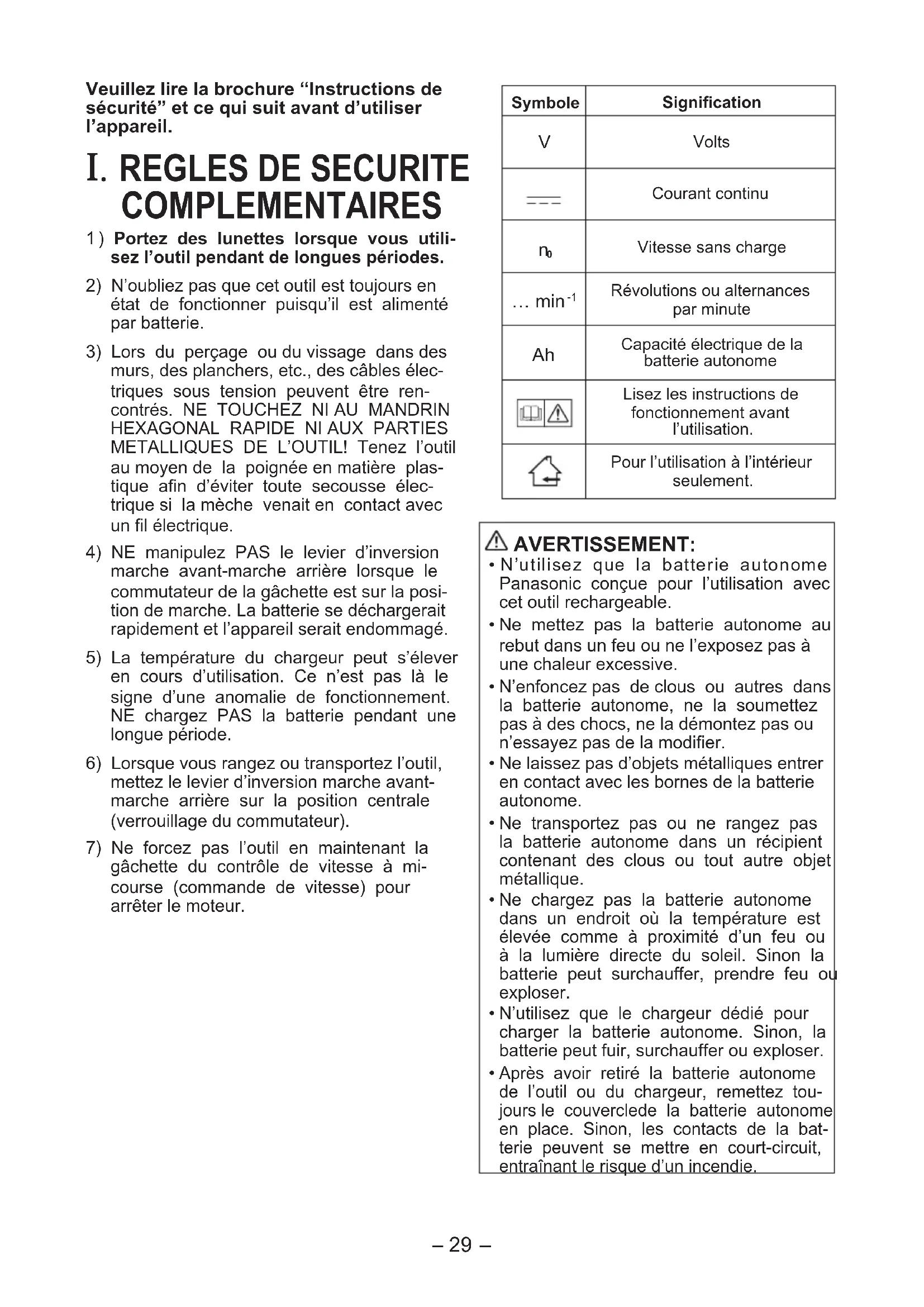 ) Portez des lunettes lorsque vous utili-sez l’outil pendant de longues périodes.2) N’oubliez pas que cet outil est toujours en état de fonctionner puisqu’il est alimenté par batterie.3) Lors du perçage ou du vissage dans des murs, des planchers, etc., des câbles élec-triques sous tension peuvent être ren-contrés. NE TOUCHEZ NI AU MANDRIN HEXAGONAL RAPIDE NI AUX PARTIES METALLIQUES DE L’OUTIL! Tenez l’outil au moyen de la poignée en matière plas-tique afin d’éviter toute secousse élec-trique si la mèche venait en contact avec un fil électrique.4) NE manipulez PAS le levier d’inversion marche avant-marche arrière lorsque le commutateur de la gâchette est sur la posi-tion de marche. La batterie se déchargerait rapidement et l’appareil serait endommagé.5) La température du chargeur peut s’élever en cours d’utilisation. Ce n’est pas là le signe d’une anomalie de fonctionnement. NE chargez PAS la batterie pendant une longue période.6) Lorsque vous rangez ou transportez l’outil, mettez le levier d’inversion marche avant-marche arrière sur la position centrale (verrouillage du commutateur).7) Ne forcez pas l’outil en maintenant la gâchette du contrôle de vitesse à mi-course (commande de vitesse) pour arrêter le moteur.Symbole Signication VoltsCourant continu