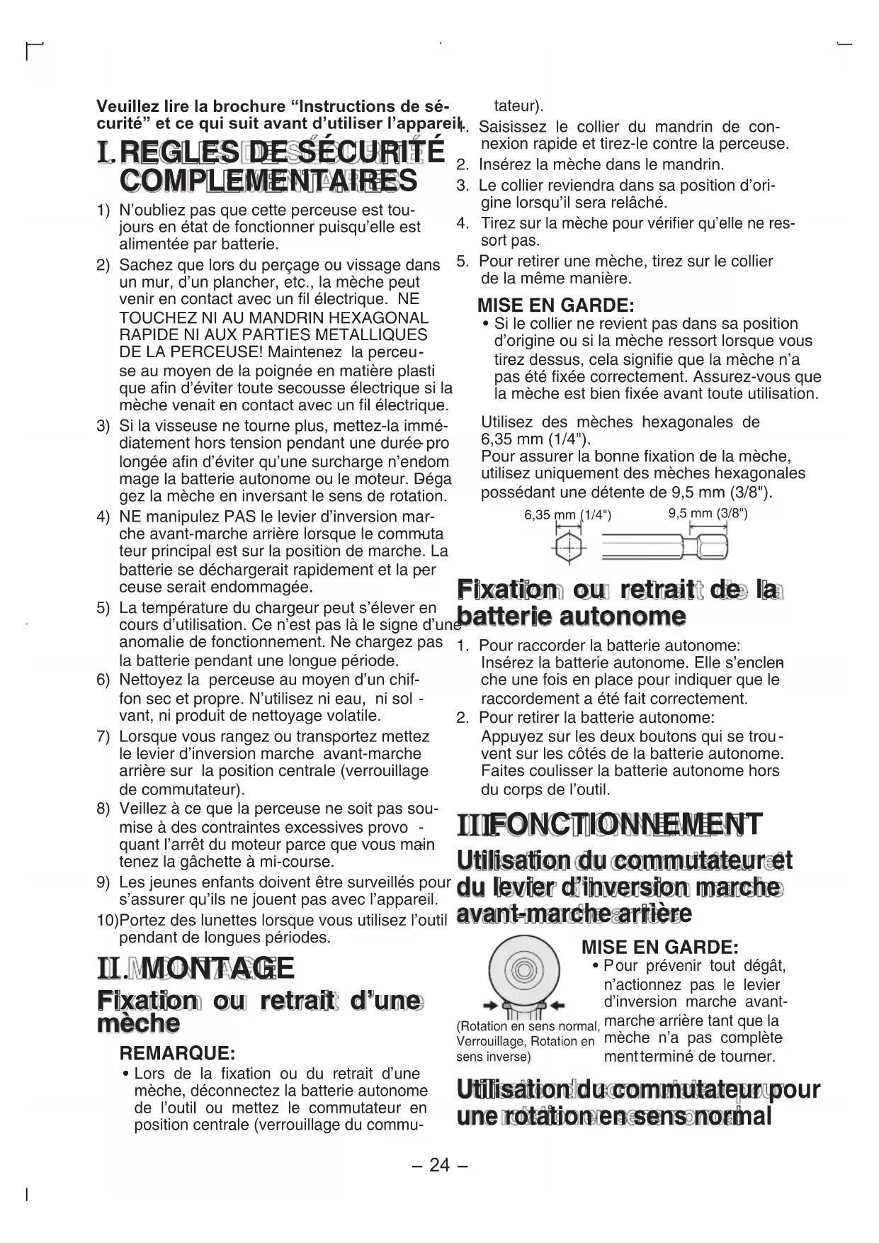 - P our prévenir tout dégât, n’actionnez pas le levier d’inversion marche avant-marche arrière tant que la mèche n’a pas complète ment terminé de tourner. Utilisation du commutateur pour une rotation en sens normal-
