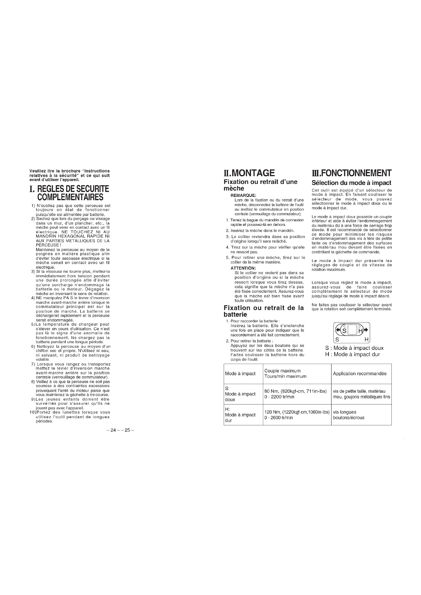 COMPLEMENTAIRES 1) N’oubliez pas que cette perceuse esttoujours en état de fonctionnerpuisqu’elle est alimentée par batterie.2) Sachez que lors du perçage ou vissagedans un mur, d’un plancher, etc., lamèche peut venir en contact avec un filélectrique. NE TOUCHEZ NI AUMANDRIN HEXAGONAL RAPIDE NIAUX PARTIES METALLIQUES DE LAPERCEUSE !Maintenez la perceuse au moyen de lapoignée en matière plastique afind’éviter toute secousse électrique si lamèche venait en contact avec un filélectrique.3) Si la visseuse ne tourne plus, mettez-laimmédiatement hors tension pendantune durée prolongée afin d’éviterqu’une surcharge n’endommage labatterie ou le moteur. Dégagez lamèche en inversant le sens de rotation.4) NE manipulez PA S le levier d’inversionmarche avant-marche arrière lorsque lecommutateur principal est sur laposition de marche. La batterie sedéchargerait rapidement et la perceuseserait endommagée.5)La température du chargeur peuts’élever en cours d’utilisation. Ce n’estpas là le signe d’une anomalie defonctionnement. Ne chargez pas labatterie pendant une longue période.6) Nettoyez la perceuse au moyen d’unchiffon sec et propre. N’utilisez ni eau,ni solvant, ni produit de nettoyagevolatile.7) Lorsque vous rangez ou transportezmettez le levier d’inversion marcheavant-marche arrière sur la positioncentrale (verrouillage de commutateur).8) Veillez à ce que la perceuse ne soit passoumise à des contraintes excessivesprovoquant l’arrêt du moteur parce quevous maintenez la gâchette à mi-course.9)Les jeunes enfants doivent êtresurveillés pour s’assurer qu’ils nejouent pas avec l’appareil.10)Portez des lunettes lorsque vousutilisez l’outil pendant de longuespériodes. III . FONCTIONNEMENT Sélection du mode à impact Cet outil est équipé d’un sélecteur demode à impact. En faisant coulisser lesélecteur de mode, vous pouvezsélectionner le mode à impact doux ou lemode à impact dur.Le mode à impact doux possède un coupleinférieur et aide à éviter l’endommagementdu matériau dû à une force de serrage tropélevée. Il est recommandé de sélectionnerce mode pour minimiser les risquesd’endommagement des vis à tête de petitetaille ou d’endommagement des surfacesen matériau mou devant être fixées encontrôlant la gâchette de commande.Le mode à impact dur présente lesréglages de couple et de vitesse derotation maximum.Lorsque vous réglez le mode à impact,assurez-vous de faire coulissercomplètement le sélecteur de modejusqu’au réglage de mode à impact désiré.Ne faites pas coulisser le sélecteur avantque la rotation soit complètement terminée.