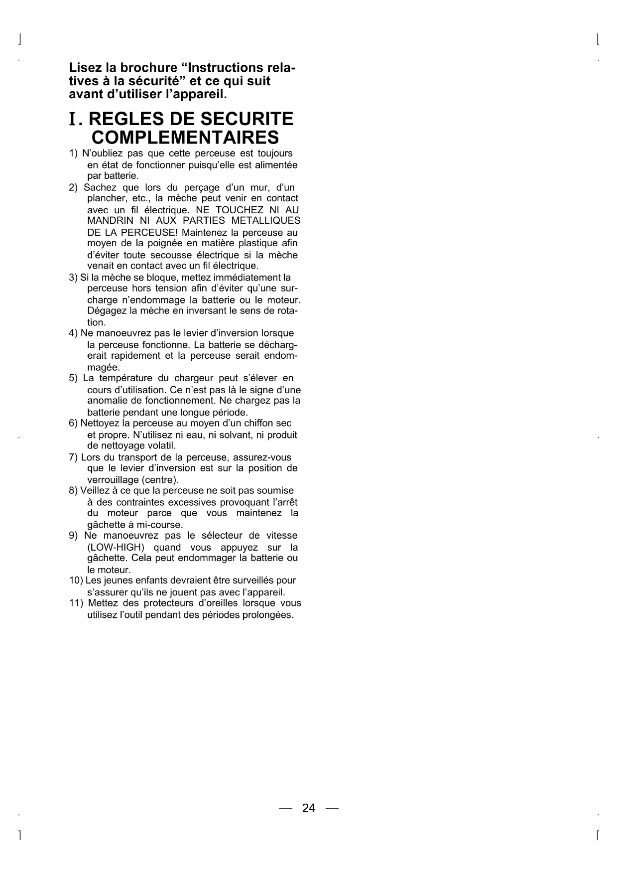 1) N'oubliez pas que cette perceuse est toujours en etat de fonctionner puisqu'elle est alimentee par batterie.