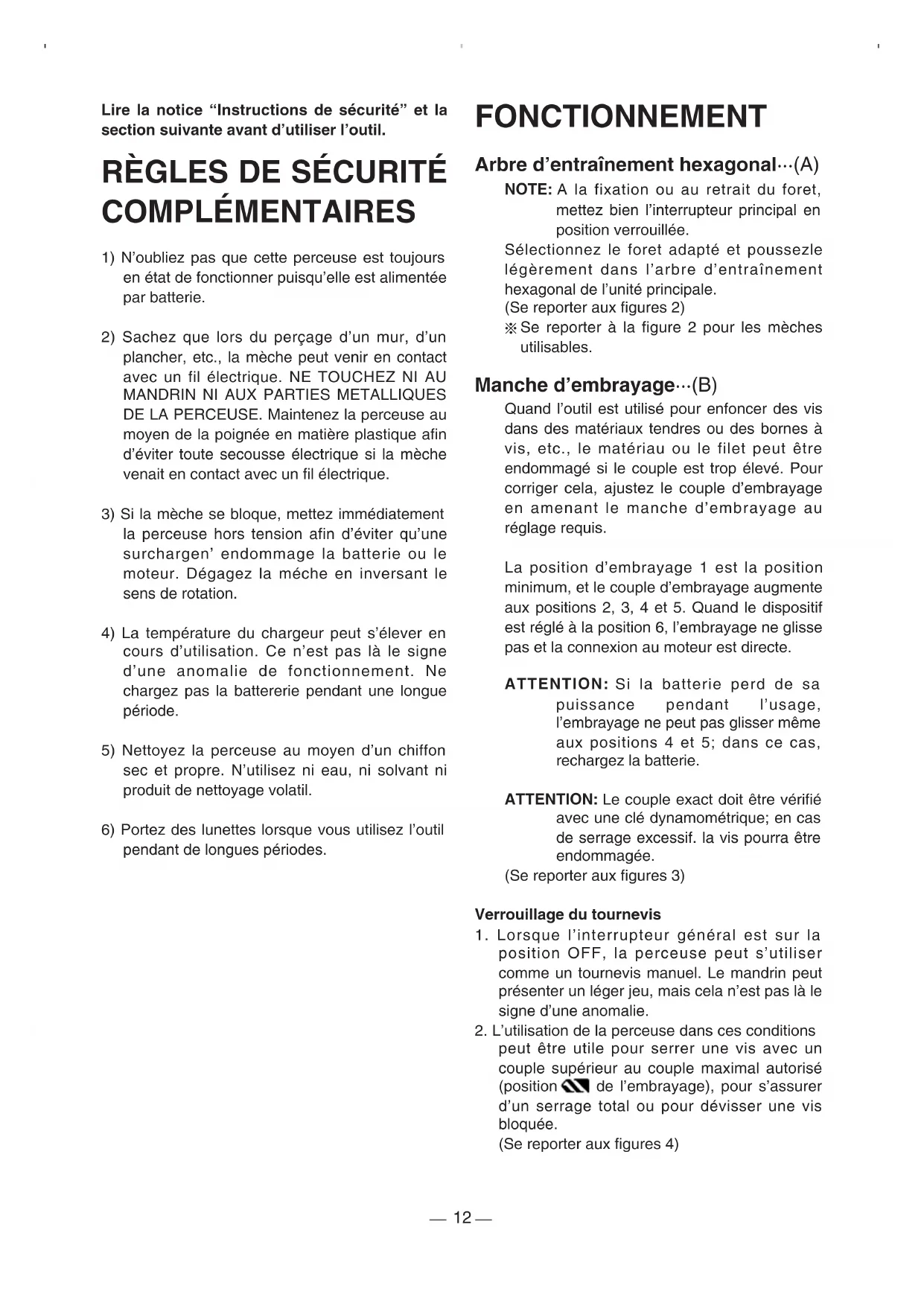 Se reporter à la figure 2 pour les mèches utilisables. Manche d’embrayage···(B) Quand l’outil est utilisé pour enfoncer des vis dans des matériaux tendres ou des bornes à vis, etc., le matériau ou le filet peut être endommagé si le couple est trop élevé. Pour corriger cela, ajustez le couple d’embrayage en amenant le manche d’embrayage au réglage requis. La position d’embrayage 1 est la position minimum, et le couple d’embrayage augmente aux positions 2, 3, 4 et 5. Quand le dispositif est réglé à la position 6, l’embrayage ne glisse pas et la connexion au moteur est directe. ATTENTION: Si la batterie perd de sa puissance pendant l’usage, l’embrayage ne peut pas glisser même aux positions 4 et 5; dans ce cas, rechargez la batterie. ATTENTION: Le couple exact doit être vérifié avec une clé dynamométrique; en cas de serrage excessif. la vis pourra être endommagée. (Se reporter aux figures 3) Verrouillage du tournevis