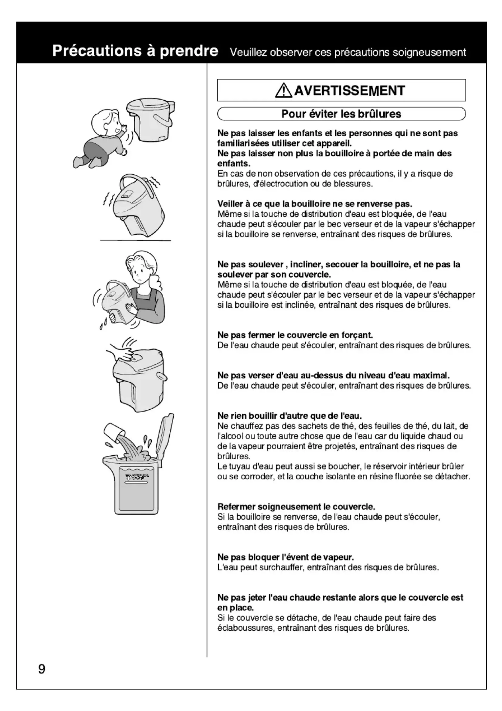 Ne pas laisser les enfants et les personnes qui ne sont pas familiarises utiliser cet appareil. Ne pas laisser non plus la bouilloire porte de main des enfants. En cas de non observation de ces prcautions, il y a risque de brlures, d'lectrocution ou de blessures. Veiller ce que la bouilloire ne se renverse pas. Mme si la touche de distribution d'eau est bloque, de l'eau chaude peut s'couler par le bec verseur et de la vapeur s'chapper si la bouilloire se renverse, entranant des risques de brlures. Ne pas soulever , incliner, secouer la bouilloire, et ne pas la soulever par son couvercle. Mme si la touche de distribution d'eau est bloque, de l'eau chaude peut s'couler par le bec verseur et de la vapeur s'chapper si la bouilloire est incline, entranant des risques de brlures. Ne pas fermer le couvercle en forant. De l'eau chaude peut s'couler, entranant des risques de brlures. Ne pas verser d'eau au-dessus du niveau d'eau maximal. De l'eau chaude peut s'couler, entranant des risques de brlures. Ne rien bouillir d'autre que de l'eau. Ne chauffez pas des sachets de th, des feuilles de th, du lait, de l'alcool ou toute autre chose que de l'eau car du liquide chaud ou de la vapeur pourraient tre projets, entranant des risques de brlures. Le tuyau d'eau peut aussi se boucher, le rservoir intrieur brler ou se corroder, et la couche isolante en rsine fluore se dtacher. Refermer soigneusement le couvercle. Si la bouilloire se renverse, de l'eau chaude peut s'couler, entranant des risques de brlures. Ne pas bloquer l'vent de vapeur. L'eau peut surchauffer, entranant des risques de brlures. Ne pas jeter l'eau chaude restante alors que le couvercle est en place. Si le couvercle se dtache, de l'eau chaude peut faire des claboussures, entranant des risques de brlures.10 AVERTISSEMENT Ne pas immerger la bouilloire dans l'eau et ne pas l'clabousser. Un court-circuit risque de se produire, entranant des risques d'lectrocution. Ne jamais dmonter, rparer ou modifier la bouilloire. Tout tentative dans ce sens risque d'entraner un dysfonctionnement de la bouilloire avec la possibilit d'un incendie ou de blessures.