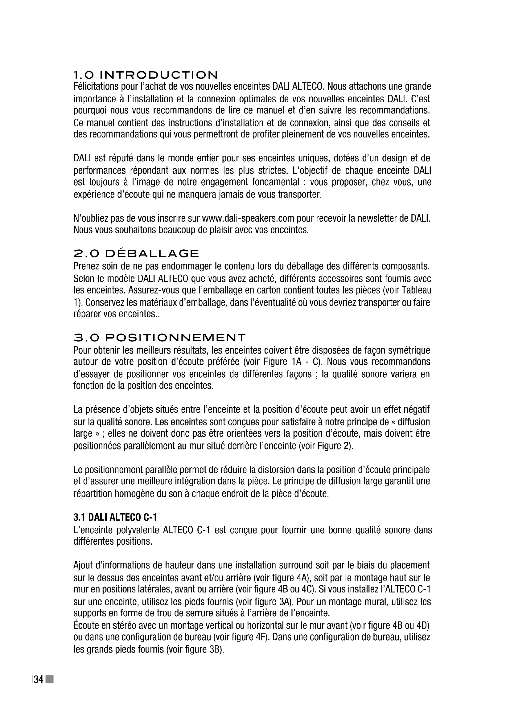 Félicitations pour l’achat de vos nouvelles enceintes DALI ALTECO. Nous attachons une grande importance à l’installation et la connexion optimales de vos nouvelles enceintes DALI. C’est pourquoi nous vous recommandons de lire ce manuel et d’en suivre les recommandations. Ce manuel contient des instructions d’installation et de connexion, ainsi que des conseils et des recommandations qui vous permettront de profiter pleinement de vos nouvelles enceintes. DALI est réputé dans le monde entier pour ses enceintes uniques, dotées d’un design et de performances répondant aux normes les plus strictes. L’objectif de chaque enceinte DALI est toujours à l’image de notre engagement fondamental : vous proposer, chez vous, une expérience d’écoute qui ne manquera jamais de vous transporter. N’oubliez pas de vous inscrire sur www.dali-speakers.com pour recevoir la newsletter de DALI. Nous vous souhaitons beaucoup de plaisir avec vos enceintes.