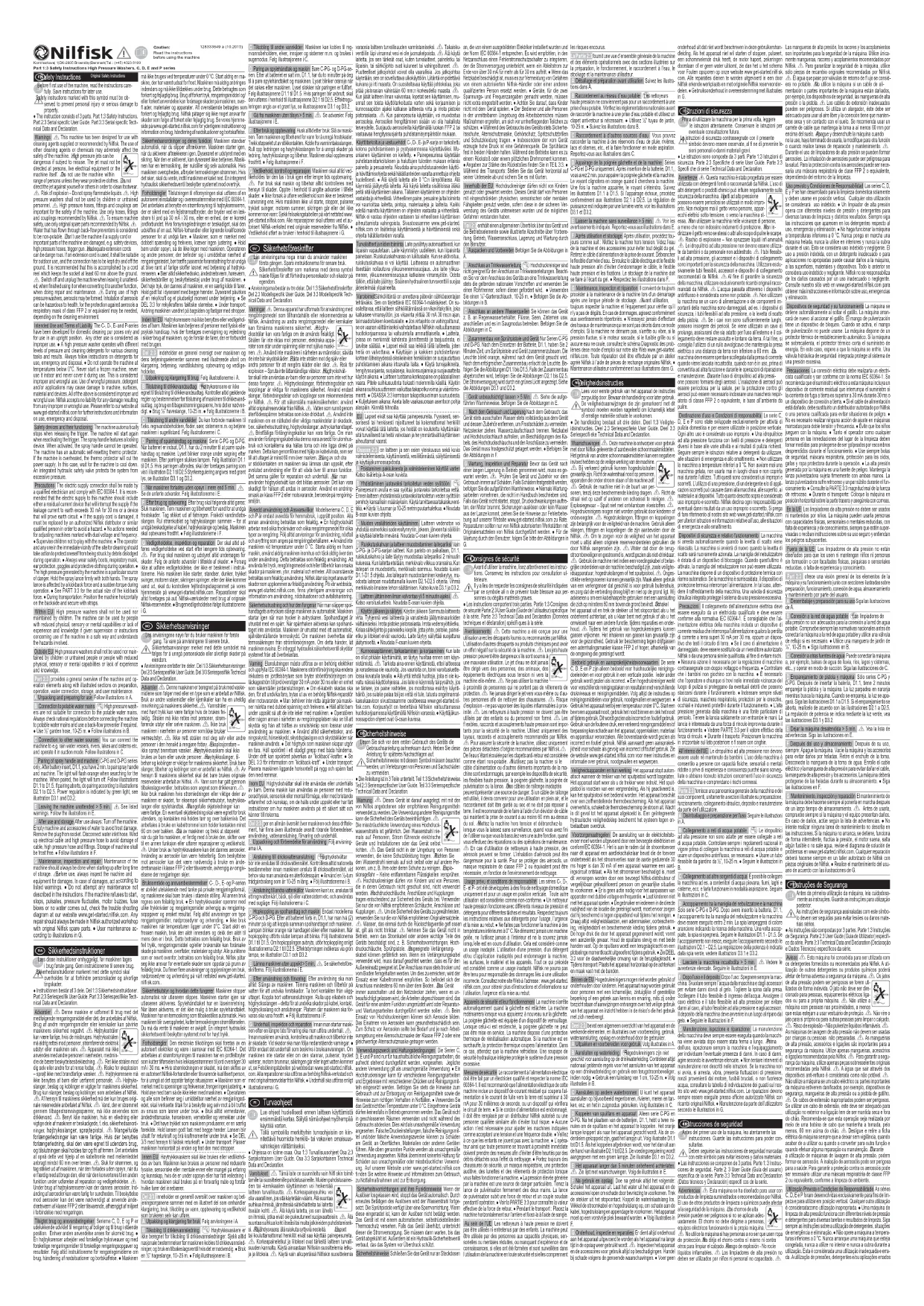Consignes de sécurité Avant d’utiliser la machine, lisez attentivement les instruc- tions. Conservez les instructions pour consultation ul- térieure. Il y a lieu de respecter les consignes de sécurité indiquées par ce symbole afi n de prévenir toute blessure aux per- sonnes ou dégâts matériels graves. ● Les instructions comportent trois parties. Partie 1:3 Consignes de sécurité Partie 2:3 User Guide (Guide de l’utilisateur) spécifi que à la série. Partie 3:3 Technical Data and Declaration (Données techniques et déclaration) spécifi ques à la série. Avertissements Cette machine a été conçue pour une utilisation avec les décapants fournis ou recommandés par Nilfi sk. L’utilisation d’autres décapants ou produits chimiques peut avoir un effet négatif sur la sécurité de la machine. Les jets haute pression peuvent être dangereux s’ils sont soumis à une mauvaise utilisation. Le jet d’eau ne doit jamais être dirigé vers des personnes, des animaux, des équipements électriques sous tension ni vers la machine elle-même. Ne pas utiliser la machine à proximité de personnes qui ne portent pas de vêtements de protection. Ne jamais diriger le jet vers vous-même ou d’au- tres personnes afi n de nettoyer des chaussures. Risque d’explosion – ne pas vaporiser des liquides infl ammables à prox- imité. Les nettoyeurs à haute pression ne doivent pas être utilisés par des enfants ou du personnel non formé. Les fl exibles, raccords et accouplements haute pression sont impor- tants pour la sécurité de la machine. Utilisez uniquement des tuyaux, raccords et accouplements recommandés par Nilfi sk. Pour assurer la sécurité de la machine, utilisez uniquement des pièces détachées d’origine recommandées par Nilfi sk. De l’eau s’étant écoulée par les clapets anti-retour est considérée comme étant non-potable. N’utilisez pas la machine si le câble d’alimentation ou d’autres éléments importants de la ma- chine sont endommagés, par exemple les dispositifs de sécurité, les fl exibles haute pression, la poignée gâchette, la poignée de pulvérisation ou la lance. Des câbles de rallonge inadaptés peuvent présenter une source de dange r. Si un câble de rallonge est utilisé, il devra convenir pour une utilisation en plein air, et le raccordement doit être gardé au sec et ne doit pas reposer à terre. Il est recommandé de le faire à l’aide d’un dévidoir de câble qui maintient la prise de courant à au moins 60 mm au-dessus du sol. Mettez la machine hors tension et débranchez-la lorsque vous la laissez sans surveillance, quand vous avez fi ni de l’utiliser ou que vous la basculez vers une autre fonction, quand vous effectuez des réparations ou des opérations de maintenance. En cas d’utilisation de nettoyeurs à haute pression, des aérosols peuvent se former. L’inhalation d’aérosols peut être dangereuse pour la santé. Pour se protéger des aérosols, un masque respiratoire de classe FFP 2 ou équivalent peut être nécessaire, en fonction de l’environnement de nettoyage. Usage prévu et conditions de responsabilité Les séries C-, D-, E- et P- ont été développées à des fi ns de nettoyage domestique uniquement et pour un usage en position verticale. Toute autre utilisation est considérée comme non-conforme. ● Un nettoyeur haute pression fonctionne avec différents niveaux de pression et détergents pour différentes tâches et résultats. Respectez toujours les instructions relatives aux détergents pour l’usage, l’urgence et la mise au rebut. ● Ne faites pas fonctionner la machine à des températures inférieures à 0° C. Ne démarrez jamais une machine gelée, ne l’utilisez jamais à l’intérieur et ne la couvrez jamais lorsqu’elle est en cours d’utilisation. Cela est considéré comme un usage inadapté. L’utilisation d’une pression, d’un détergent et/ou d’application inadaptés peut endommager la machine, les surfaces, le matériel et les appareils. Tout ce qui précède est considéré comme un usage inadapté. Nilfi sk ne pourra pas être tenu pour responsable des dommages liés à une utilisation incorrecte. Consultez notre site Web à l’adresse : www.get-started. nilfi sk.com, pour obtenir plus d’instructions et d’informations sur l’utilisation, l’urgence et la mise au rebut. Appareils de sécurité et leur fonctionnement La machine s’arrête automa tiquement quand la gâchette est relâchée. La machine redémarrera lorsque vous appuierez à nouveau sur la gâchette. La poignée gâchette est équipée d’un dispositif de verrouillage. Lorsque celui-ci est enclenché, la poignée gâchette ne peut pas être mise en service. La machine dispose d’une protection thermique de réinitialisation automatique. Si la machine est en surchauffe, la protection thermique coupera l’alimentation. Dans ce cas, attendez que la machine refroidisse. Une soupape de sécurité hydraulique intégrée protège le système d’une pression excessive. Mesures de sécurité Le raccordement à l’alimentation électrique doit être fait par un électricien qualifi é et respecter la norme IEC 60364-1. Il est recommandé que l’alimentation électrique de cette machine inclue un dispositif de courant résiduel qui coupera l’al- imentation si le courant de fuite vers la terre est supérieur à 30 mA pour 30 millièmes de seconde, ou un dispositif qui vérifi era le circuit de terre. ● Si le cordon d’alimentation est endommagé, il doit être remplacé par un distributeur Nilfi sk autorisé ou une personne qualifi ée similaire afi n d’éviter tout risque. ● Aucune action n’est nécessaire pour ajuster les machines indiquées comme acceptant une tension et une fréquence double. ● Veillez à ce que les enfants ne jouent pas avec la machine. ● L’opéra- teur ainsi que toute personne se trouvant à proximité immédiate doivent prendre des mesures afi n