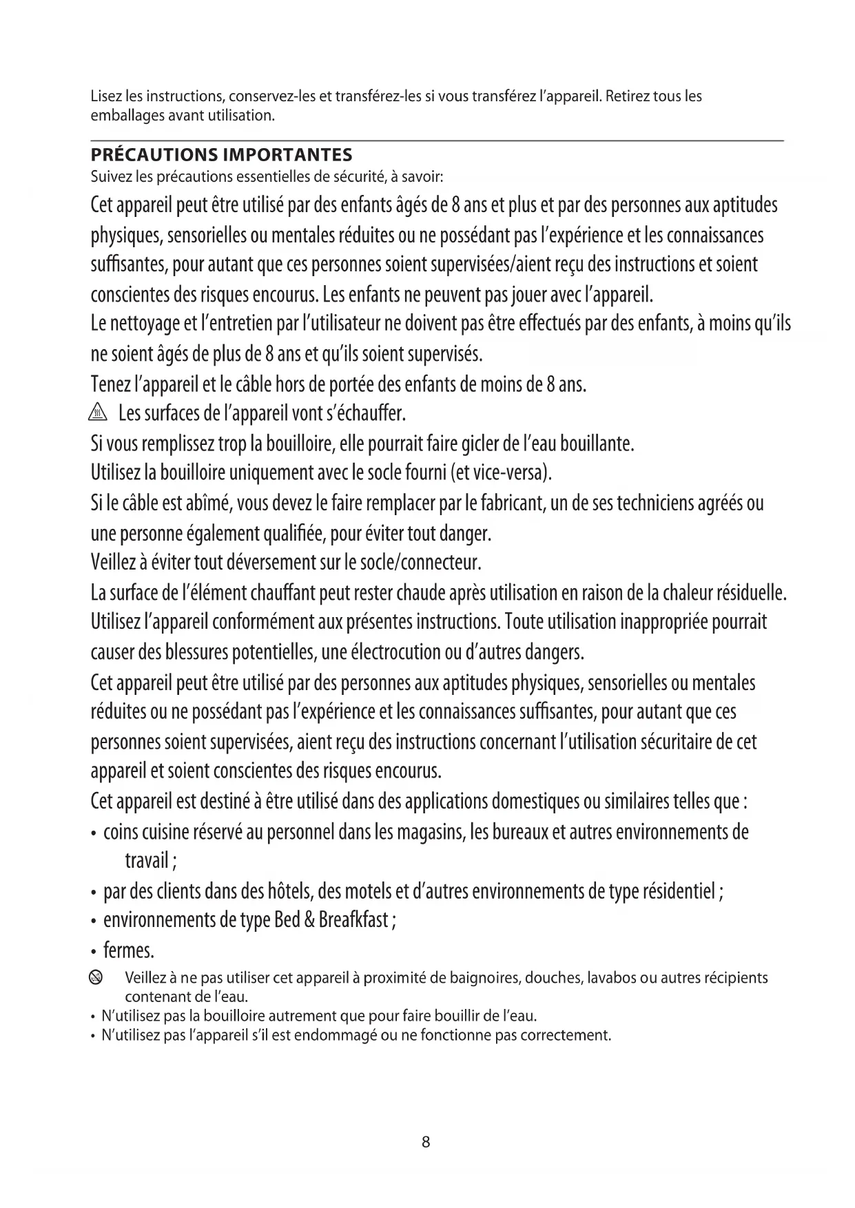 Suivez les précautions essentielles de sécurité, à savoir: Cet appareil peut être utilisé par des enfants âgés de 8 ans et plus et par des personnes aux aptitudes physiques, sensorielles ou mentales réduites ou ne possédant pas l’expérience et les connaissances susantes, pour autant que ces personnes soient supervisées/aient reçu des instructions et soient conscientes des risques encourus. Les enfants ne peuvent pas jouer avec l’appareil. Le nettoyage et l’entretien par l’utilisateur ne doivent pas être eectués par des enfants, à moins qu’ils ne soient âgés de plus de 8 ans et qu’ils soient supervisés. Tenez l’appareil et le câble hors de portée des enfants de moins de 8 ans. h Les surfaces de l’appareil vont s’échauer. Si vous remplissez trop la bouilloire, elle pourrait faire gicler de l’eau bouillante. Utilisez la bouilloire uniquement avec le socle fourni (et vice-versa). Si le câble est abîmé, vous devez le faire remplacer par le fabricant, un de ses techniciens agréés ou une personne également qualiée, pour éviter tout danger. Veillez à éviter tout déversement sur le socle/connecteur. La surface de l’élément chauant peut rester chaude après utilisation en raison de la chaleur résiduelle. Utilisez l’appareil conformément aux présentes instructions. Toute utilisation inappropriée pourrait causer des blessures potentielles, une électrocution ou d’autres dangers. Cet appareil peut être utilisé par des personnes aux aptitudes physiques, sensorielles ou mentales réduites ou ne possédant pas l’expérience et les connaissances susantes, pour autant que ces personnes soient supervisées, aient reçu des instructions concernant l’utilisation sécuritaire de cet appareil et soient conscientes des risques encourus. Cet appareil est destiné à être utilisé dans des applications domestiques ou similaires telles que :