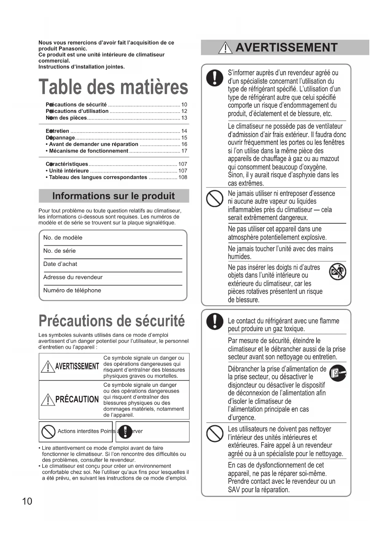 - Tableau des langues correspondantes ................... 108 Table des matières Précautions de sécurité Informations sur le produit Pour tout problème ou toute question relatifs au climatiseur, les informations ci-dessous sont requises. Les numéros de modèle et de série se trouvent sur la plaque signalétique.No. de modèle No. de série Date d’achatAdresse du revendeurNuméro de téléphoneS’informer auprès d’un revendeur agréé ou d’un spécialiste concernant l’utilisation du type de réfrigérant spécié. L’utilisation d’un type de réfrigérant autre que celui spécié comporte un risque d’endommagement du produit, d’éclatement et de blessure, etc.Le climatiseur ne possède pas de ventilateur d’admission d’air frais extérieur. Il faudra donc ouvrir fréquemment les portes ou les fenêtres si l’on utilise dans la même pièce des appareils de chauffage à gaz ou au mazout qui consomment beaucoup d’oxygène. Sinon, il y aurait risque d’asphyxie dans les cas extrêmes.Ne jamais utiliser ni entreposer d’essence ni aucune autre vapeur ou liquides inammables près du climatiseur — cela serait extrêmement dangereux.Ne pas utiliser cet appareil dans une atmosphère potentiellement explosive.Ne jamais toucher l’unité avec des mains humides.Ne pas insérer les doigts ni d’autres objets dans l’unité intérieure ou extérieure du climatiseur, car les pièces rotatives présentent un risque de blessure.Le contact du réfrigérant avec une amme peut produire un gaz toxique.Par mesure de sécurité, éteindre le climatiseur et le débrancher aussi de la prise secteur avant son nettoyage ou entretien.Débrancher la prise d’alimentation de la prise secteur, ou désactiver le disjoncteur ou désactiver le dispositif de déconnexion de l’alimentation an d’isoler le climatiseur de l’alimentation principale en cas d’urgence.Les utilisateurs ne doivent pas nettoyer l’intérieur des unités intérieures et extérieures. Faire appel à un revendeur agréé ou à un spécialiste pour le nettoyage.En cas de dysfonctionnement de cet appareil, ne pas le réparer soi-même. Prendre contact avec le revendeur ou un SAV pour la réparation.Les symboles suivants utilisés dans ce mode d’emploi avertissent d’un danger potentiel pour l’utilisateur, le personnel d’entretien ou l’appareil : AVERTISSEMENT Ce symbole signale un danger ou des opérations dangereuses qui risquent d’entraîner des blessures physiques graves ou mortelles. PRÉCAUTION Ce symbole signale un danger ou des opérations dangereuses qui risquent d’entraîner des blessures physiques ou des dommages matériels, notamment de l’appareil. AVERTISSEMENT Nous vous remercions d’avoir fait l’acquisition de ce produit Panasonic.Ce produit est une unité intérieure de climatiseur commercial.Instructions d’installation jointes.Actions interdites Points à observer• Lire attentivement ce mode d’emploi avant de faire fonctionner le climatiseur. Si l’on rencontre des difcultés ou des problèmes, consulter le revendeur.• Le climatiseur est conçu pour créer un environnement confortable chez soi. Ne l’utiliser qu’aux ns pour lesquelles il a été prévu, en suivant les instructions de ce mode d’emploi. OI_00_291492_EU.indb 10 2017/6/20 10:47:1111 FRANÇAIS Cet appareil est conçu pour être utilisé par des utilisateurs expérimentés ou conrmés en magasin, dans l’industrie légère et dans les fermes, ou pour une utilisation commerciale par les profanes. Cet appareil peut être utilisé par des enfants à partir de 8 ans et des personnes aux facultés physiques, sensorielles ou mentales diminuées ou sans expérience ni expertise sous la surveillance d’un adulte ou s’ils ont reçu des instructions concernant l’utilisation sécuritaire de l’appareil et s’ils comprennent les risques encourus.Les enfants ne doivent pas jouer avec l’appareil. Le nettoyage et la maintenance utilisateur ne doivent pas être effectués par un enfant laissé sans surveillance. Placer l’alarme incendie et la sortie d’air à au moins 1,5 m de l’unité. Ne pas trop refroidir ou chauffer une pièce où se trouvent des bébés ou des malades. Ne pas mettre le climatiseur sous et hors tension à l’aide de l’interrupteur d’alimentation du système. Utiliser le bouton de marche/arrêt de fonctionnement (ON/OFF). Ne rien introduire dans la sortie d’air de l’unité extérieure. Cela est très dangereux, car le ventilateur marche à grande vitesse. Ne pas toucher l’arrivée d’air ou les ailettes coupantes en aluminium de l’unité extérieure. Il y a un risque de blessure. Ne pas introduire d’objet dans le BOITIER DU VENTILATEUR. Il y a un risque de blessure et l’unité pourrait être endommagée. Cesser d’utiliser le produit lorsqu’une anomalie ou défaillance quelconque se produit et débrancher la che d’alimentation ou mettre hors tension l’interrupteur et le disjoncteur. (Risque de fumée/incendie/décharge électrique) Exemples d’anomalie ou défaillance :