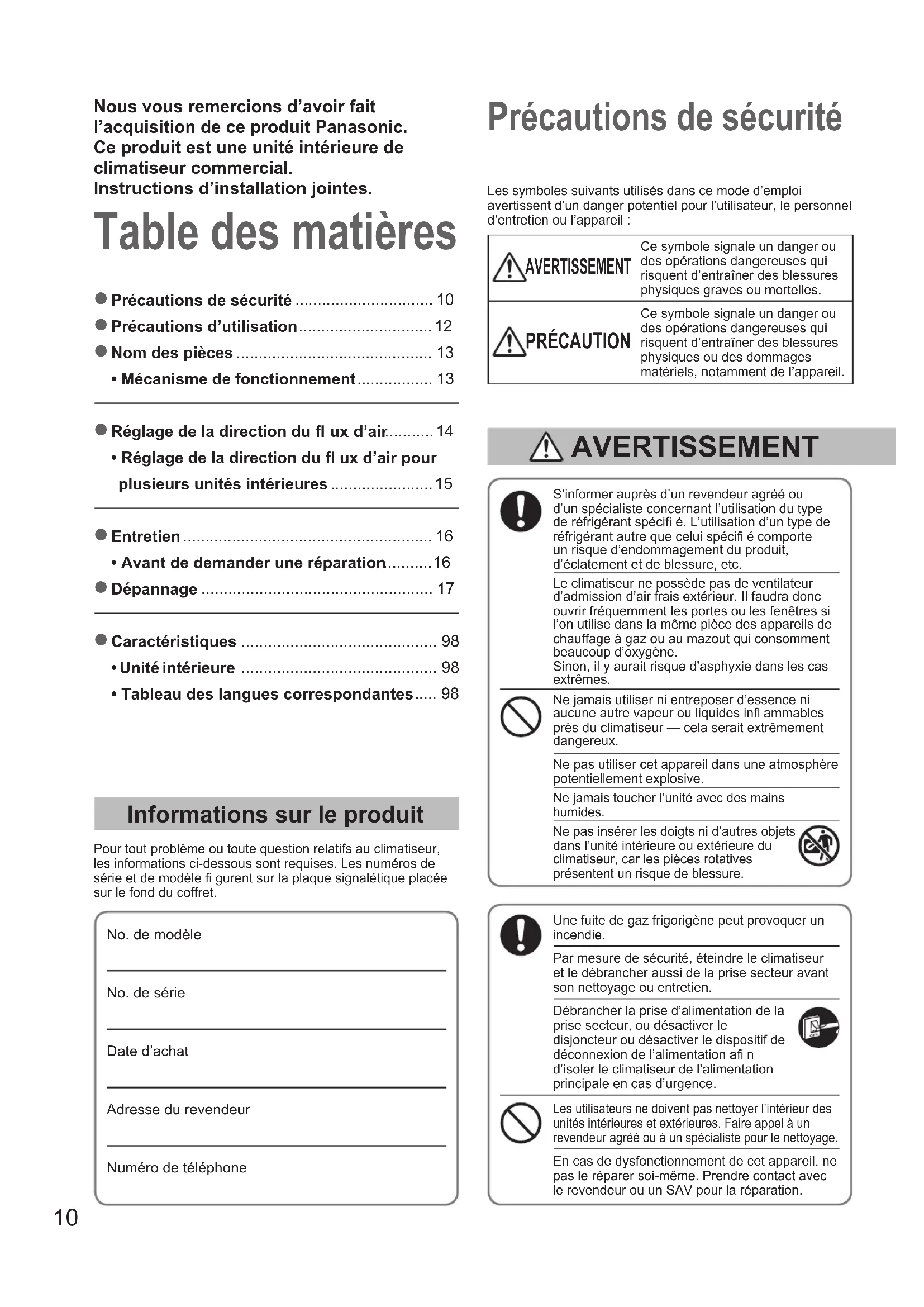 - • Tableau des langues correspondantes Table des matières Précautions de sécurité Informations sur le produit Pour tout problème ou toute question relatifs au climatiseur, les informations ci-dessous sont requises. Les numéros de série et de modèle fi gurent sur la plaque signalétique placée sur le fond du coffret.No. de modèle No. de série Date d’achatAdresse du revendeurNuméro de téléphoneS’informer auprès d’un revendeur agréé ou d’un spécialiste concernant l’utilisation du type de réfrigérant spécifi é. L’utilisation d’un type de réfrigérant autre que celui spécifi é comporte un risque d’endommagement du produit, d’éclatement et de blessure, etc.Le climatiseur ne possède pas de ventilateur d’admission d’air frais extérieur. Il faudra donc ouvrir fréquemment les portes ou les fenêtres si l’on utilise dans la même pièce des appareils de chauffage à gaz ou au mazout qui consomment beaucoup d’oxygène. Sinon, il y aurait risque d’asphyxie dans les cas extrêmes.Ne jamais utiliser ni entreposer d’essence ni aucune autre vapeur ou liquides infl ammables près du climatiseur — cela serait extrêmement dangereux.Ne pas utiliser cet appareil dans une atmosphère potentiellement explosive.Ne jamais toucher l’unité avec des mains humides.Ne pas insérer les doigts ni d’autres objets dans l’unité intérieure ou extérieure du climatiseur, car les pièces rotatives présentent un risque de blessure.Une fuite de gaz frigorigène peut provoquer un incendie.Par mesure de sécurité, éteindre le climatiseur et le débrancher aussi de la prise secteur avant son nettoyage ou entretien.Débrancher la prise d’alimentation de la prise secteur, ou désactiver le disjoncteur ou désactiver le dispositif de déconnexion de l’alimentation afi n d’isoler le climatiseur de l’alimentation principale en cas d’urgence.Les utilisateurs ne doivent pas nettoyer l’intérieur des unités intérieures et extérieures. Faire appel à un revendeur agréé ou à un spécialiste pour le nettoyage.En cas de dysfonctionnement de cet appareil, ne pas le réparer soi-même. Prendre contact avec le revendeur ou un SAV pour la réparation.Les symboles suivants utilisés dans ce mode d’emploi avertissent d’un danger potentiel pour l’utilisateur, le personnel d’entretien ou l’appareil : AVERTISSEMENT Ce symbole signale un danger ou des opérations dangereuses qui risquent d’entraîner des blessures physiques graves ou mortelles. PRÉCAUTION Ce symbole signale un danger ou des opérations dangereuses qui risquent d’entraîner des blessures physiques ou des dommages matériels, notamment de l’appareil. AVERTISSEMENT Nous vous remercions d’avoir fait l’acquisition de ce produit Panasonic.Ce produit est une unité intérieure de climatiseur commercial.Instructions d’installation jointes. OI00284010EUall.indb10OI00284010EUall.indb10 2013/11/2914:35:362013/11/2914:35:3611 FRANÇAIS Cet appareil est conçu pour être utilisé par des utilisateurs expérimentés ou confi rmés en magasin, dans l’industrie légère et dans les fermes, ou pour une utilisation commerciale par les profanes. Cet appareil peut être utilisé par des enfants à partir de 8 ans et des personnes aux facultés physiques, sensorielles ou mentales diminuées ou sans expérience ni expertise sous la surveillance d’un adulte ou s’ils ont reçu des instructions concernant l’utilisation sécuritaire de l’appareil et s’ils comprennent les risques encourus. Placer l’alarme incendie et la sortie d’air à au moins 1,5 m de l’unité. Ne pas trop refroidir ou chauffer une pièce où se trouvent des bébés ou des malades. Ne pas mettre le climatiseur sous et hors tension à l’aide de l’interrupteur d’alimentation du système. Utiliser le bouton de marche/arrêt de fonctionnement (ON/OFF). Ne rien introduire dans la sortie d’air de l’unité extérieure. Cela est très dangereux, car le ventilateur marche à grande vitesse. Ne pas toucher l’arrivée d’air ou les ailettes coupantes en aluminium de l’unité extérieure. Il y a un risque de blessure. Ne pas introduire d’objet dans le BOITIER DU VENTILATEUR. Il y a un risque de blessure et l’unité pourrait être endommagée. Prévoir une prise électrique à utiliser exclusivement pour chaque unité, et prévoir un dispositif de déconnexion de l’alimentation, un disjoncteur et un disjoncteur de fuite pour la protection contre surintensité de courant dans la ligne exclusive. Prévoir une prise secteur électrique exclusive pour chaque unité, et un moyen de déconnexion totale de l’alimentation ayant une séparation de contact sur tous les pôles doit être incorporé au câblage fi xe conformément aux normes de câblage. Pour éviter les risques possibles d’une défaillance d’isolation, l’unité doit être mise à la terre. Ne pas utiliser de cordon, de rallonge ou de cordon non spécifi é afi n d’éviter tout risque de surchauffe et d’incendie. Cesser d’utiliser le produit lorsqu’une anomalie ou défaillance quelconque se produit et débrancher la fi che d’alimentation ou mettre hors tension l’interrupteur et le disjoncteur. (Risque de fumée/incendie/décharge électrique) Exemples d’anomalie ou défaillance : p. 98