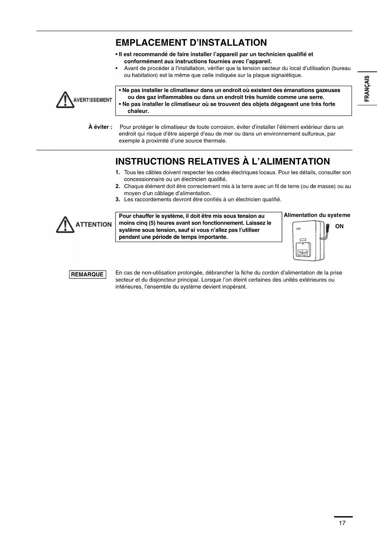 - Ne pas installer le climatiseur où se trouvent des objets dégageant une très forte chaleur. À éviter : Pour protéger le climatiseur de toute corrosion, éviter d’installer l’élément extérieur dans un endroit qui risque d’être aspergé d’eau de mer ou dans un environnement sulfureux, par exemple à proximité d’une source thermale. Pour chauffer le système, il doit être mis sous tension au moins cinq (5) heures avant son fonctionnement. Laissez le système sous tension, sauf si vous n’allez pas l’utiliser pendant une période de temps importante. En cas de non-utilisation prolongée, débrancher la fiche du cordon d’alimentation de la prise secteur et du disjoncteur principal. Lorsque l’on éteint certaines des unités extérieures ou intérieures, l’ensemble du système devient inopérant. Alimentation du syst