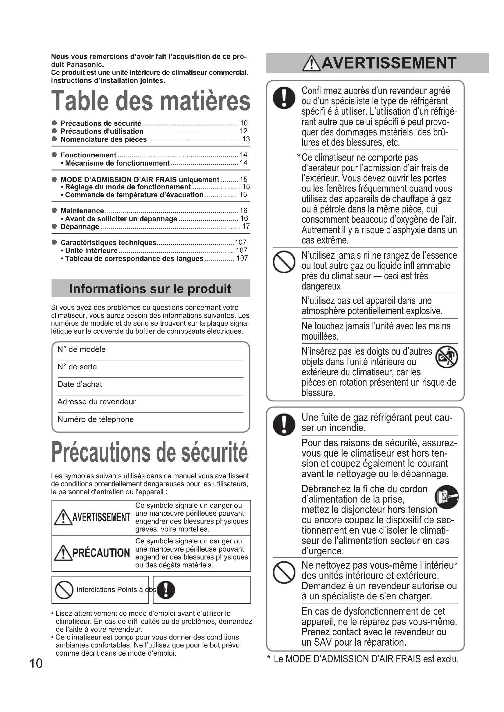 - • Tableau de correspondance des langues Table des matières Précautions de sécurité Informations sur le produit Si vous avez des problèmes ou questions concernant votre climatiseur, vous aurez besoin des informations suivantes. Les numéros de modèle et de série se trouvent sur la plaque signa-létique sur le couvercle du boîtier de composants électriques.N° de modèle N° de série Date d’achatAdresse du revendeurNuméro de téléphone Confi rmez auprès d’un revendeur agréé ou d’un spécialiste le type de réfrigérant spécifi é à utiliser. L’utilisation d’un réfrigé- rant autre que celui spécifi é peut provo- quer des dommages matériels, des brû- lures et des blessures, etc. Ce climatiseur ne comporte pas d’aérateur pour l’admission d’air frais de l’extérieur. Vous devez ouvrir les portes ou les fenêtres fréquemment quand vous utilisez des appareils de chauffage à gaz ou à pétrole dans la même pièce, qui consomment beaucoup d’oxygène de l’air. Autrement il y a risque d’asphyxie dans un cas extrême. N’utilisez jamais ni ne rangez de l’essence ou tout autre gaz ou liquide infl ammable près du climatiseur — ceci est très dangereux. N’utilisez pas cet appareil dans une atmosphère potentiellement explosive. Ne touchez jamais l’unité avec les mains mouillées. N’insérez pas les doigts ou d’autres objets dans l’unité intérieure ou extérieure du climatiseur, car les pièces en rotation présentent un risque de blessure. Une fuite de gaz réfrigérant peut cau- ser un incendie. Pour des raisons de sécurité, assurez- vous que le climatiseur est hors ten- sion et coupez également le courant avant le nettoyage ou le dépannage. Débranchez la fi che du cordon d’alimentation de la prise, mettez le disjoncteur hors tension ou encore coupez le dispositif de sec- tionnement en vue d’isoler le climati- seur de l’alimentation secteur en cas d’urgence. Ne nettoyez pas vous-même l’intérieur des unités intérieure et extérieure. Demandez à un revendeur autorisé ou à un spécialiste de s’en charger. En cas de dysfonctionnement de cet appareil, ne le réparez pas vous-même. Prenez contact avec le revendeur ou un SAV pour la réparation. Les symboles suivants utilisés dans ce manuel vous avertissent de conditions potentiellement dangereuses pour les utilisateurs, le personnel d’entretien ou l’appareil : AVERTISSEMENT Ce symbole signale un danger ou une manœuvre périlleuse pouvant engendrer des blessures physiques graves, voire mortelles. PRÉCAUTION Ce symbole signale un danger ou une manœuvre périlleuse pouvant engendrer des blessures physiques ou des dégâts matériels.Interdictions Points à observerNous vous remercions d’avoir fait l’acquisition de ce pro-duit Panasonic.Ce produit est une unité intérieure de climatiseur commercial.Instructions d’installation jointes.• Lisez attentivement ce mode d’emploi avant d’utiliser le climatiseur. En cas de diffi cultés ou de problèmes, demandez de l’aide à votre revendeur.• Ce climatiseur est conçu pour vous donner des conditions ambiantes confortables. Ne l’utilisez que pour le but prévu comme décrit dans ce mode d’emploi. AVERTISSEMENT p. 107