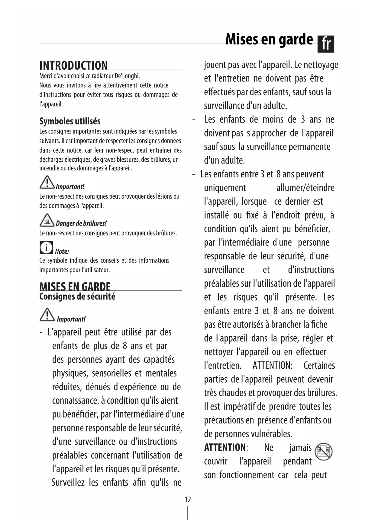 INTRODUCTION Merci d'avoir choisi ce radiateur De'Longhi. Nous vous invitons à lire attentivement cette notice d'instructions pour éviter tous risques ou dommages de l'appareil. Symboles utilisés Les consignes importantes sont indiquées par les symboles suivants. Il est important de respecter les consignes données dans cette notice, car leur non-respect peut entraîner des décharges électriques, de graves blessures, des brûlures, un incendie ou des dommages à l'appareil. Important! Le non-respect des consignes peut provoquer des lésions ou des dommages à l'appareil. Danger de brûlures!Le non-respect des consignes peut provoquer des brûlures. Note:Ce symbole indique des conseils et des informations importantes pour l'utilisateur.
