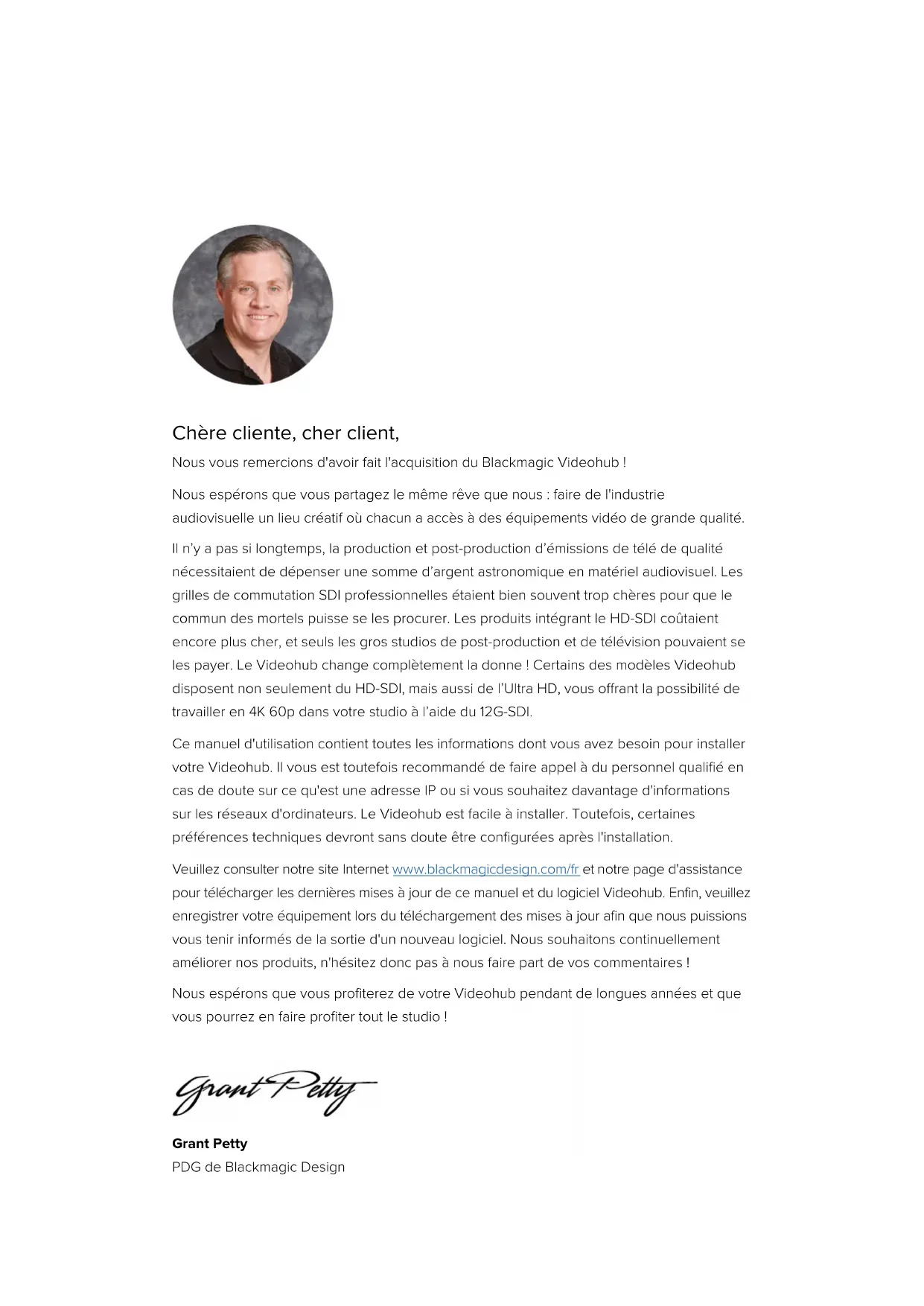 保証Juin 2023 Manuel d'installation et d’utilisation Blackmagic Videohub 12G Universal Videohub Smart Videohub CleanSwitch 12x12 Videohub Master Control Pro Videohub Smart Control Pro Blackmagic GPI and Tally Interface Blackmagic VideohubChère cliente, cher client, Nous vous remercions d'avoir fait l'acquisition du Blackmagic Videohub ! Nous espérons que vous partagez le même rêve que nous : faire de l'industrie audiovisuelle un lieu créatif où chacun a accès à des équipements vidéo de grande qualité. Il n’y a pas si longtemps, la production et post-production d’émissions de télé de qualité nécessitaient de dépenser une somme d’argent astronomique en matériel audiovisuel. Les grilles de commutation SDI professionnelles étaient bien souvent trop chères pour que le commun des mortels puisse se les procurer. Les produits intégrant le HD-SDI coûtaient encore plus cher, et seuls les gros studios de post-production et de télévision pouvaient se les payer. Le Videohub change complètement la donne! Certains des modèles Videohub disposent non seulement du HD-SDI, mais aussi de l’Ultra HD, vous offrant la possibilité de travailler en 4K 60p dans votre studio à l’aide du 12G-SDI. Ce manuel d'utilisation contient toutes les informations dont vous avez besoin pour installer votre Videohub. Il vous est toutefois recommandé de faire appel à du personnel qualifié en cas de doute sur ce qu'est une adresse IP ou si vous souhaitez davantage d'informations sur les réseaux d'ordinateurs. Le Videohub est facile à installer. Toutefois, certaines préférences techniques devront sans doute être configurées après l'installation. Veuillez consulter notre site Internet www.blackmagicdesign.com/fr et notre page d'assistance pour télécharger les dernières mises à jour de ce manuel et du logiciel Videohub. Enfin, veuillez enregistrer votre équipement lors du téléchargement des mises à jour afin que nous puissions vous tenir informés de la sortie d'un nouveau logiciel. Nous souhaitons continuellement améliorer nos produits, n'hésitez donc pas à nous faire part de vos commentaires ! Nous espérons que vous profiterez de votre Videohub pendant de longues années et que vous pourrez en faire profiter tout le studio! Grant Petty PDG de Blackmagic DesignSommaire Présentation du Blackmagic Videohub 189 Mise en route 192 Connecter l’alimentation 192 Connecter la vidéo 192 Contrôler le Videohub 192 Modifier un routage à l’aide du panneau de contrôle intégré 193 Boutons de raccourci 194 Utiliser les boutons de raccourci 195 Verrouiller et déverrouiller le routage 197 Connecter le Videohub à un réseau 198 Configurer les paramètres réseau 199 Grilles de commutation UniversalVideohub 199 Universal Videohub288 199 Configuration de l’Universal Videohub288 201 Universal Videohub 72 207 Configuration de l’Universal Videohub 72 208 Carte d’interface SDI 212 Cartes d’interface pour Universal Videohub 213 Câble de télécommande pour Universal Videohub 214 Smart Videohub CleanSwitch 12x12 215 Panneaux de contrôle matériels Videohub 215 Videohub Master Control Pro 215 Videohub Smart Control Pro 216 Configurer le panneau de contrôle 216 Connexion au réseau Ethernet 217 État des boutons sur le panneau de contrôle 218 Niveaux de routage 219 Comment sélectionner les sources et les destinations 220 Utiliser le Videohub Smart Control Pro comme contrôleurCut-Bus 225 Utiliser le Videohub Smart Control Pro comme contrôleurXY 226 Personnalisation des boutons 227 Blackmagic MultiView 16 227 Utiliser le panneau de contrôle 228 GPI and Tally Interface 230 Logiciel Blackmagic Videohub 231 Blackmagic Videohub Setup 231 Personnaliser les libellés des entrées et sorties 232 Régler les sorties en mode Cut-bus 233 Créer des macros 233 Mapper des boutons 234 Onglet Setup 235 Mise à jour du Videohub 236 Blackmagic Videohub Control 237 Sélectionner un Videohub 237 Ajouter des boutons 238 Visualiser le routage 238 Modifier le routage 238 Aperçu du Blackmagic Videohub Control 239 Contrôler le Blackmagic MultiView 16 248 Blackmagic Videohub Hardware PanelSetup 250 Paramètres du réseau (Network) 250 Configuration du Videohub Master Control Pro 252 Configuration du Videohub Smart Control Pro 253 Configuration des GPI 256 Configuration du tally 257 Developer Information 261 Blackmagic Videohub Ethernet Protocol v2.3 261 Videohub RS-422 Protocol 267 Saving and Loading Labels withTelnet in Mac OS 270 Saving and Loading Labels withTelnet in Windows 271 Remplacer un ventilateur sur l’UniversalVideohub 273 Aide 274 Avis règlementaires 275 Informations de sécurité 276 Garantie 277 188 VideohubPrésentation du Blackmagic Videohub Votre Blackmagic Videohub fait partie d’une gamme de produits Videohub conçue pour les studios et les salles de toute taille. Tous les modèles Videohub peuvent se connecter à un réseau Ethernet pour un contrôle matériel externe ou via le logiciel Videohub Control. Les modèles Blackmagic Videohub 10x10 12G, 20x20 12G et 40x40 12G sont des grilles de commutation 12G-SDI intégrant un panneau de contrôle et une prise en charge de l’Ultra HD 2160p60. Ces appareils peuvent s’installer sur un bureau ou dans un rack à l’aide des supports latéraux fournis. Blackmagic Videohub 10x10 12G Blackmagic Videohub 20x20 12G Blackmagic Videohub 40x40 12G 189Présentation du Blackmagic VideohubLes modèles Universal Videohub288 et 72 sont des grilles de commutations 3G-SDI modulaires et montables sur rack pour les plus grands studios et les plus grandes salles où davantage de matériel HD est connecté. Universal Videohub288 Universal Videohub 72 190Présentation du Blackmagic VideohubLe Smart Videohub CleanSwitch 12x12 est un Videohub 6G-SDI montable sur rack qui intègre un synchronisateur sur chaque entrée. Vous pouvez ainsi modifier des routages de façon propre sur des moniteurs ou directement à l’antenne. Smart Videohub CleanS