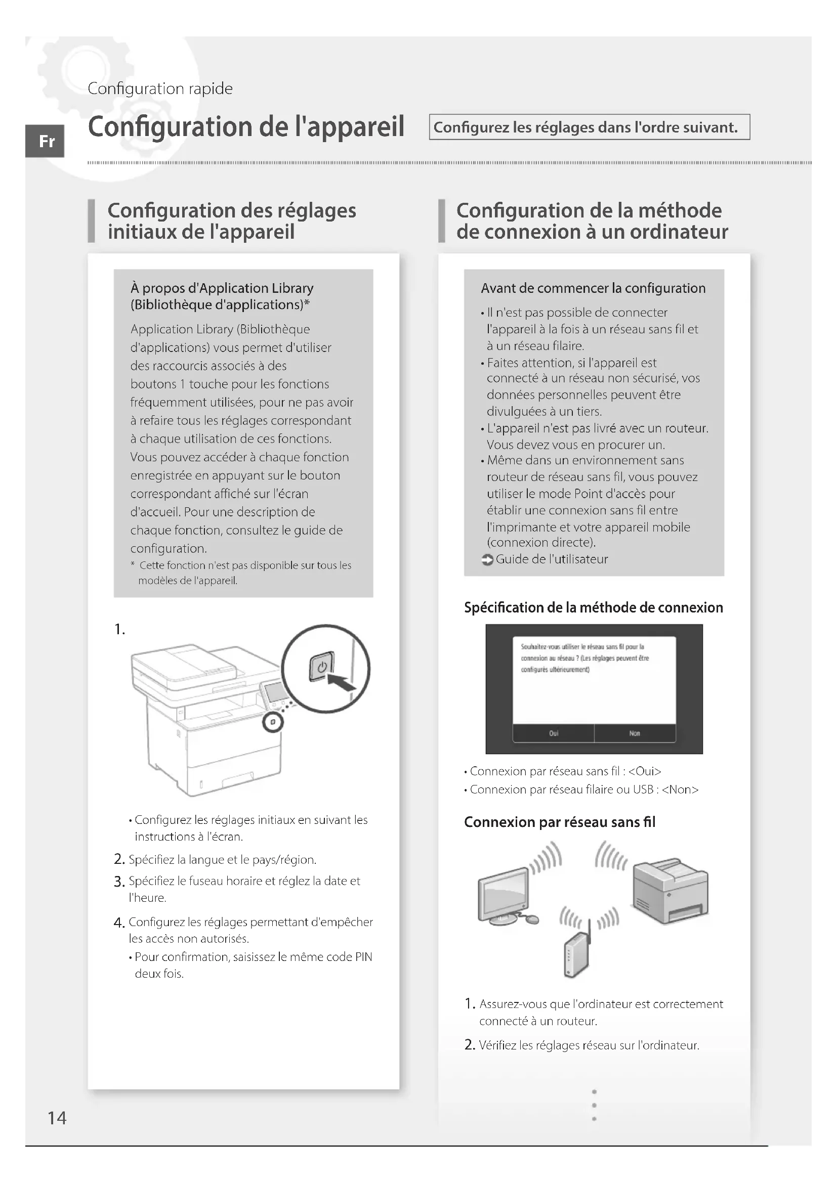 - Configurez les réglages initiaux en suivant les instructions à l'écran. Spécifiez la langue et le pays/région. Spécifiez le fuseau horaire et réglez la date et l'heure. Configurez les réglages permettant d'empêcher les accès non autorisés.• Pour confirmation, saisissez le même code PIN deux fois.Avant de commencer la configuration• Il n'est pas possible de connecter l'appareil à la fois à un réseau sans fil et à un réseau filaire.• Faites attention, si l'appareil est connecté à un réseau non sécurisé, vos données personnelles peuvent être divulguées à un tiers.• L'appareil n'est pas livré avec un routeur. Vous devez vous en procurer un.• Même dans un environnement sans routeur de réseau sans fil, vous pouvez utiliser le mode Point d'accès pour établir une connexion sans fil entre l'imprimante et votre appareil mobile (connexion directe). Guide de l'utilisateurSpécication de la méthode de connexion• Connexion par réseau sans fil: <Oui>• Connexion par réseau filaire ou USB: <Non>Connexion par réseau sans l Assurez-vous que l'ordinateur est correctement connecté à un routeur. Vérifiez les réglages réseau sur l'ordinateur.