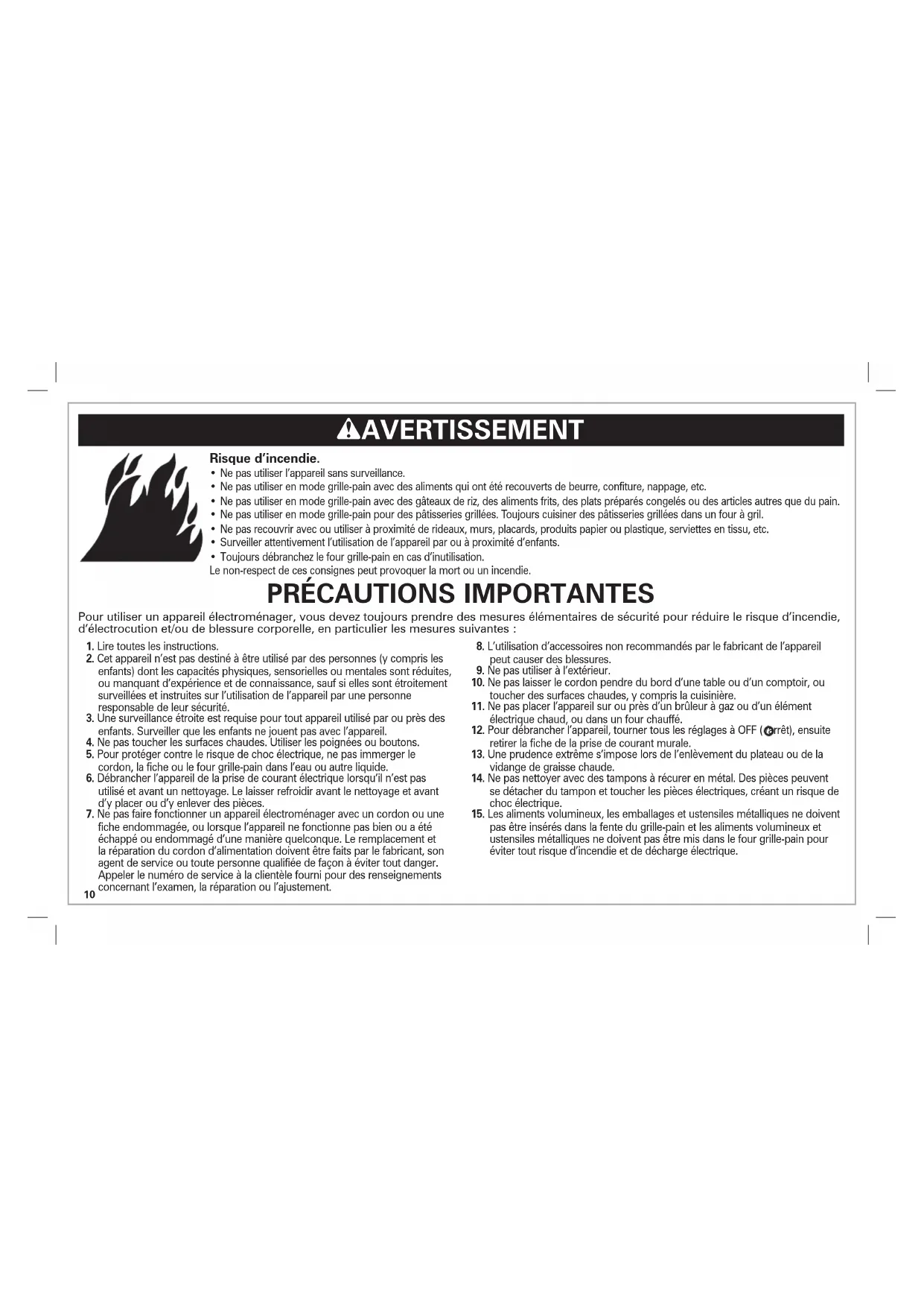 pas être insérés dans la fente du grille-pain et les aliments volumineux et ustensiles métalliques ne doivent pas être mis dans le four grille-pain pour éviter tout risque d’incendie et de décharge électrique. Pour utiliser un appareil électroménager, vous devez toujours prendre des mesures élémentaires de sécurité pour réduire le risque d’incendie, d’électrocution et/ou de blessure corporelle, en particulier les mesures suivantes : wAVERTISSEMENT Risque d’incendie.