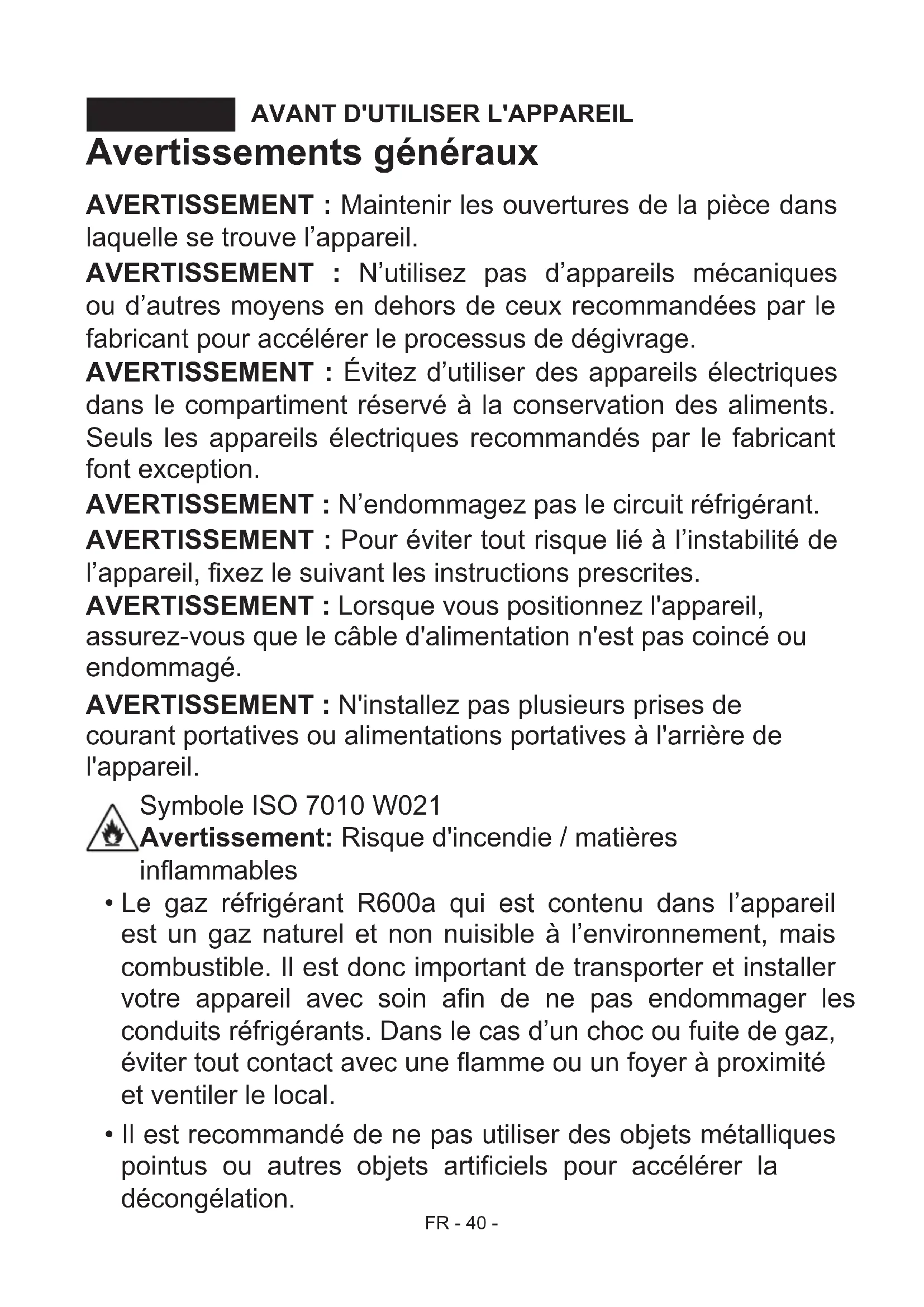 - Le gaz réfrigérant R600a qui est contenu dans l’appareil est un gaz naturel et non nuisible à l’environnement, mais combustible. Il est donc important de transporter et installer votre appareil avec soin an de ne pas endommager les conduits réfrigérants. Dans le cas d’un choc ou fuite de gaz, éviter tout contact avec une amme ou un foyer à proximité et ventiler le local.