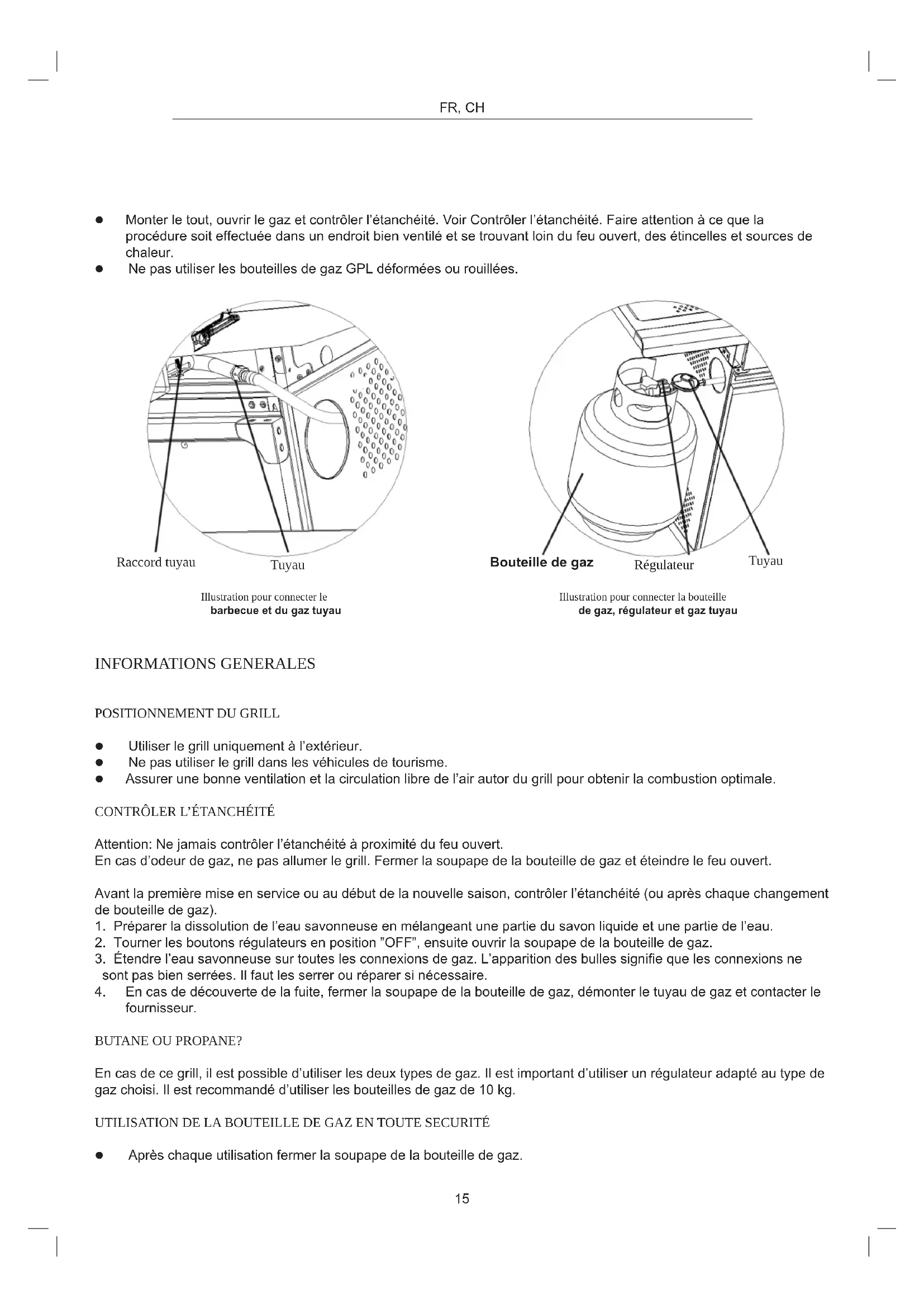 Lire attentivement les instructions concernant la sécurité, l'allumage et l'emploi. Vérifier si les trous d'écoulement de gaz, les tuyaux du brûleur ou les brûleurs ne sont pas bouchés. - Vérifier si le tuyau du brûleur est correctement mis par le trou de fermeture. Vérifier si la bouteille de gaz est remplie. Vérifier l'étanchéité en se servant de l'eau savonneuse. - Tourner le bouton régulateur en position "OFF" et fermer l'amnée de gaz. - Avant d'allumer le grill, ouvrir le couvercle.
