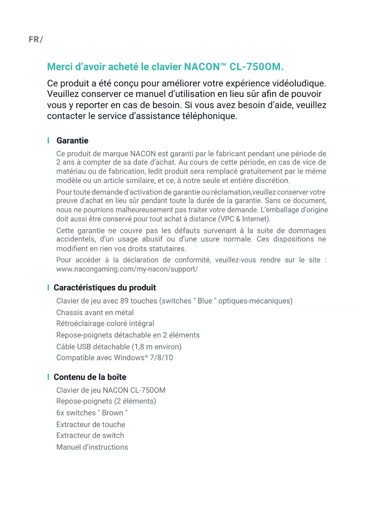 7/8/10 are a registered trademarks of Microsoft Corporation.FR / Merci d’avoir acheté le clavier NACON™ CL-750OM. Ce produit a été conçu pour améliorer votre expérience vidéoludique. Veuillez conserver ce manuel d’utilisation en lieu sûr an de pouvoir vous y reporter en cas de besoin. Si vous avez besoin d’aide, veuillez contacter le service d’assistance téléphonique. I Garantie Ce produit de marque NACON est garanti par le fabricant pendant une période de 2 ans à compter de sa date d’achat. Au cours de cette période, en cas de vice de matériau ou de fabrication, ledit produit sera remplacé gratuitement par le même modèle ou un article similaire, et ce, à notre seule et entière discrétion. Pour toute demande d'activation de garantie ou réclamation, veuillez conserver votre preuve d'achat en lieu sûr pendant toute la durée de la garantie. Sans ce document, nous ne pourrions malheureusement pas traiter votre demande. L’emballage d’origine doit aussi être conservé pour tout achat à distance (VPC & Internet). Cette garantie ne couvre pas les défauts survenant à la suite de dommages accidentels, d’un usage abusif ou d’une usure normale. Ces dispositions ne modient en rien vos droits statutaires. Pour accéder à la déclaration de conformité, veuillez-vous rendre sur le site : www.nacongaming.com/my-nacon/support/ I Caractéristiques du produit Clavier de jeu avec 89 touches (switches " Blue " optiques-mécaniques) Chassis avant en métal Rétroéclairage coloré intégral Repose-poignets détachable en 2 éléments Câble USB détachable (1,8 m environ) Compatible avec Windows