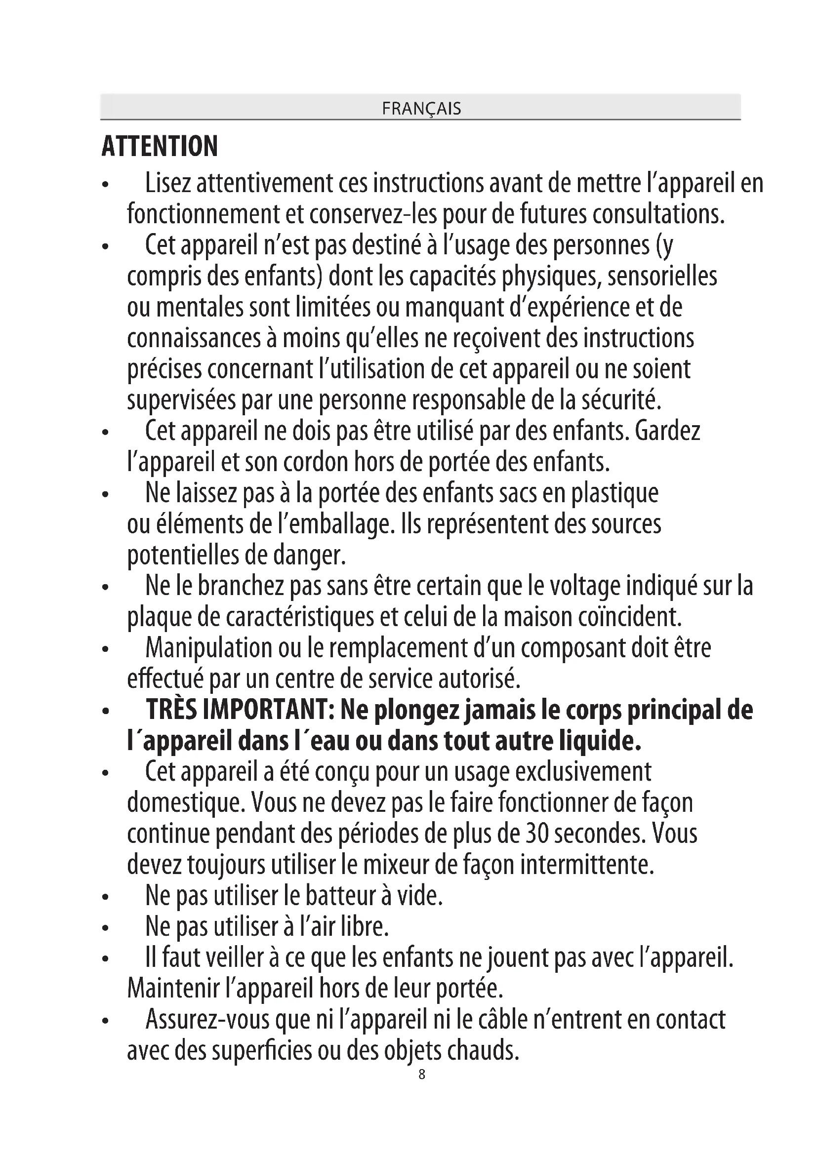 - Cet appareil a été conçu pour un usage exclusivement domestique. Vous ne devez pas le faire fonctionner de façon continue pendant des périodes de plus de 30 secondes. Vous devez toujours utiliser le mixeur de façon intermittente.