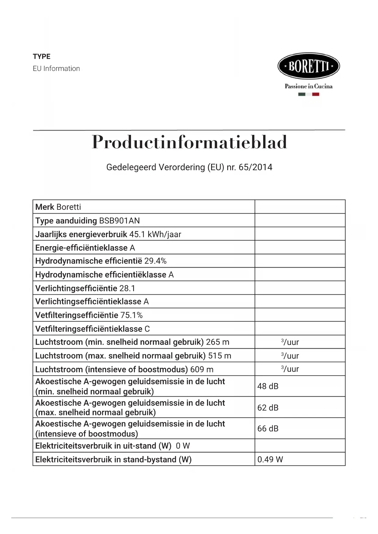 /uur Émissions acoustiques dans l’air pondérées de la valeur A (vitesse minimale en fonctionnement normal) 48 dB Émissions acoustiques dans l’air pondérées de la valeur A (vitesse maximale en fonctionnement normal) 62 dB Émissions acoustiques dans l’air pondérées de la valeur A (mode intensif ou «boost») 66 dB Consommation d’électricité en mode «arrêt» (W) 0 W Consommation d’électricité en mode «veille» (W) 0.49 W Fiche d’information sur le produit Règlement délégué (UE) n° 65/2014EU Information TYPE Trademark Boretti Model identier BSB901AN Annual Energy Consumption 45.1 kWh/jaar Energy Efciency Class A Fluid Dynamic Efciency 29.4% Fluid Dynamic Efciency class A Lighting Efciency 28.1 Lighting Efciency class A Grease Filtering Efciency 75.1% Grease Filtering Efciency class C Air ow (min speed normal use) 265 m