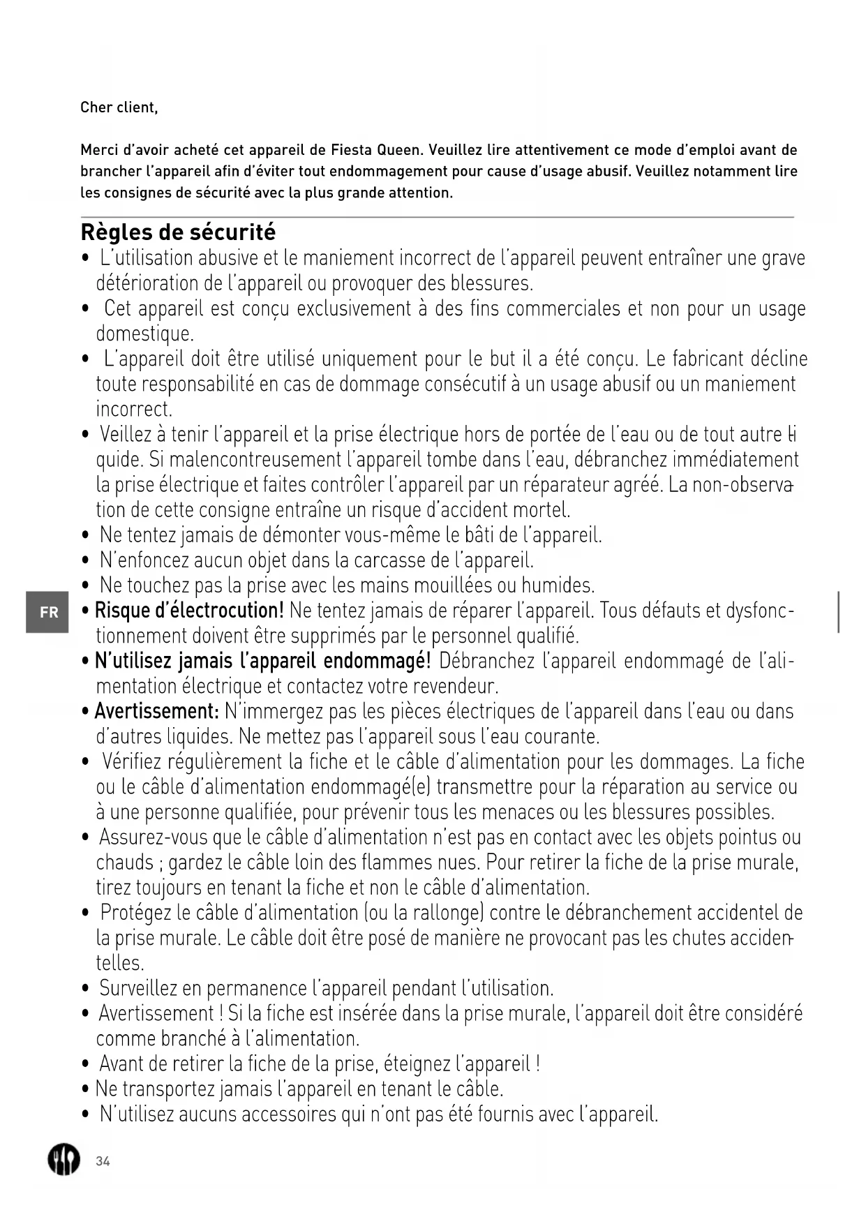 Cher client, Merci d’avoir acheté cet appareil de Fiesta Queen. Veuillez lire attentivement ce mode d’emploi avant de brancher l’appareil afin d’éviter tout endommagement pour cause d’usage abusif. Veuillez notamment lire les consignes de sécurité avec la plus grande attention. Règles de sécurité