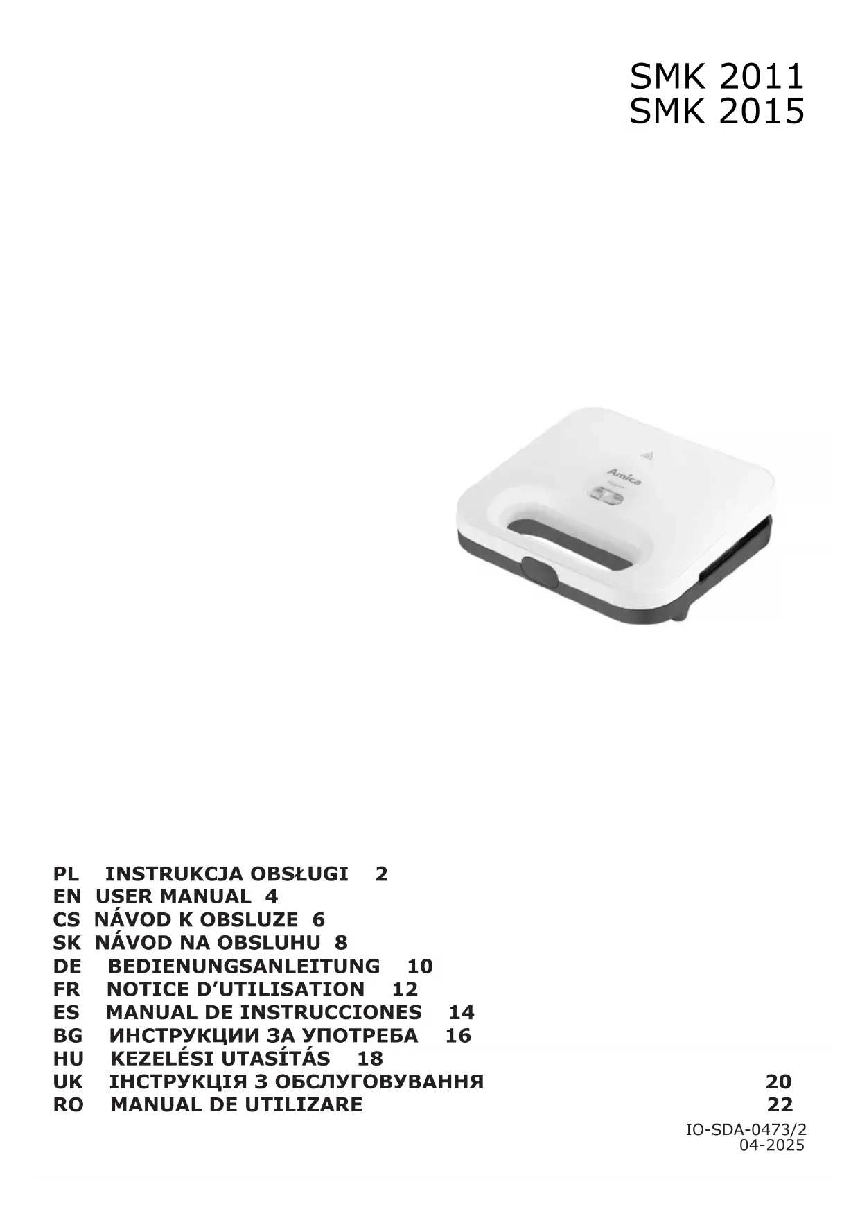 Ne pas placer l’appareil sur un brûleur à gaz, électrique chaud ni à proximité d’eux ni à des endroits où il pourrait entrer en contact avec des sources de chaleur. Aenon : le pain peut brûler. Lors de l’ulisaon du grillepain, as- surer un espace susant audessus de l’appareil et de tous les côtés pour une libre circulaon de l’air. Lors de son fonconnement, l’ap- pareil ne peut pas toucher les rideaux, les décoraons murales, les vêtements, les essuietout ou d’autres matériaux inammables. Sur les surfaces sensibles aux températures élevées, il est recommandé d’uliser un support d’isolaon thermique. Ne pas uliser l’appareil pour griller des produits alimentaires contenant du sucre, des produits transformés à base de fruits ou des conservateurs. Aenon ! L’appareil n’est pas conçu pour être ulisé avec un inter- rupteur horaire extérieur ou un système de commande à distance. L’appareil est conçu pour chauer et décongeler le pain, ne pas l’u- liser à d’autres ns. Ne pas toucher la surface marquée avec le symbole , ni au cours du fonconnement de l’appareil ni après. Ces surfaces sont chaudes. Vérier si la tension indiquée sur la plaque signaléque correspond aux paramètres de l’alimentaon électrique à la maison, tout en s’assurant que cee alimentaon est marquée par ~ (courant alter- naf). DONNÉES TECHNIQUES : Modèle SMK 2011 SMK 2015 tension nominale AC 220240V 50/60Hz AC 230V 50Hz puissance nominale 750 W 750 W Cordon d’alimentaon ~0,85m ~0,85m Logement (couleur) Blanc + Gris Gris ÉLÉMENTS DE L’ÉQUIPEMENT: