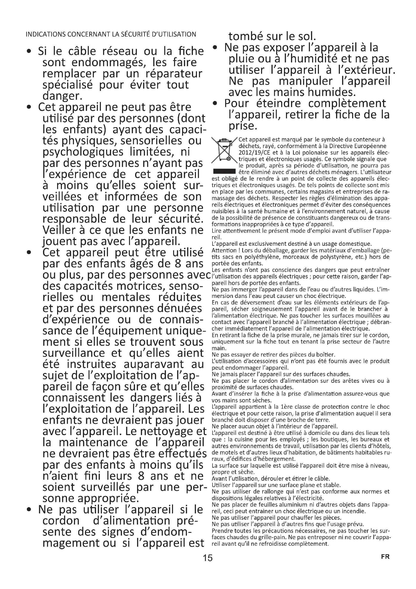 - Pour éteindre complètement l’appareil, rerer la che de la prise. Cet appareil est marqué par le symbole du conteneur à déchets, rayé, conformément à la Direcve Européenne 2012/19/CE et à la Loi polonaise sur les appareils élec- triques et électroniques usagés. Ce symbole signale que le produit, après sa période d’ulisaon, ne pourra pas être éliminé avec d’autres déchets ménagers. L'ulisateur est obligé de le rendre à un point de collecte des appareils élec- triques et électroniques usagés. De tels points de collecte sont mis en place par les communes, certains magasins et entreprises de ra- massage des déchets. Respecter les règles d’éliminaon des appa- reils électriques et électroniques permet d’éviter des conséquences nuisibles à la santé humaine et à l’environnement naturel, à cause de la possibilité de présence de constuants dangereux ou de trans- formaons inappropriées à ce type d’appareil. Lire aenvement le présent mode d’emploi avant d’uliser l’appa- reil. L’appareil est exclusivement desné à un usage domesque. Aenon ! Lors du déballage, garder les matériaux d’emballage (pe- ts sacs en polyéthylène, morceaux de polystyrène, etc.) hors de portée des enfants. Les enfants n’ont pas conscience des dangers que peut entraîner l’ulisaon des appareils électriques ; pour cee raison, garder l’ap- pareil hors de portée des enfants. Ne pas immerger l’appareil dans de l’eau ou d’autres liquides. L’im- mersion dans l’eau peut causer un choc électrique. En cas de déversement d’eau sur les éléments extérieurs de l’ap- pareil, sécher soigneusement l’appareil avant de le brancher à l’alimentaon électrique. Ne pas toucher les surfaces mouillées au contact avec l’appareil branché à l’alimentaon électrique ; débran- cher immédiatement l’appareil de l’alimentaon électrique. En rerant la che de la prise murale, ne jamais rer sur le cordon, uniquement sur la che tout en tenant la prise secteur de l’autre main. Ne pas essayer de rerer des pièces du boîer. L’ulisaon d’accessoires qui n’ont pas été fournis avec le produit peut endommager l’appareil. Ne jamais placer l’appareil sur des surfaces chaudes. Ne pas placer le cordon d’alimentaon sur des arêtes vives ou à proximité de surfaces chaudes. Avant d’insérer la che à la prise d’alimentaon assurezvous que vos mains sont sèches. L’appareil apparent à la 1ère classe de protecon contre le choc électrique et pour cee raison, la prise d’alimentaon auquel il sera branché doit disposer d’une broche de terre. Ne placer aucun objet à l’intérieur de l’appareil. L’appareil est desné à être ulisé à domicile ou dans des lieux tels que : la cuisine pour les employés ; les bouques, les bureaux et autres environnements de travail, ulisaon par les clients d’hôtels, de motels et d’autres lieux d’habitaon, de bâments habitables ru- raux, d’édices d’hébergement. La surface sur laquelle est ulisé l’appareil doit être mise à niveau, propre et sèche. Avant l’ulisaon, dérouler et érer le câble. Uliser l’appareil sur une surface plane et stable. Ne pas uliser de rallonge qui n’est pas conforme aux normes et disposions légales relaves à l’électricité. Ne pas placer de feuilles aluminium ni d’autres objets dans l’appa- reil, ceci peut entrainer un choc électrique ou un incendie. Ne pas uliser l’appareil pour chauer les pièces. Ne pas uliser l’appareil à d’autres ns que l’usage prévu. Prendre toutes les précauons nécessaires, ne pas toucher les sur- faces chaudes du grillepain. Ne pas entreposer ni ne couvrir l’appa- reil avant qu’il ne refroidisse complètement.16