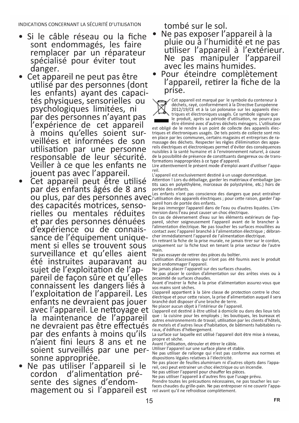 - Pour éteindre complètement l’appareil, rerer la che de la prise. Cet appareil est marqué par le symbole du conteneur à déchets, rayé, conformément à la Direcve Européenne 2012/19/CE et à la Loi polonaise sur les appareils élec- triques et électroniques usagés. Ce symbole signale que le produit, après sa période d’ulisaon, ne pourra pas être éliminé avec d’autres déchets ménagers. L'ulisateur est obligé de le rendre à un point de collecte des appareils élec- triques et électroniques usagés. De tels points de collecte sont mis en place par les communes, certains magasins et entreprises de ra- massage des déchets. Respecter les règles d’éliminaon des appa- reils électriques et électroniques permet d’éviter des conséquences nuisibles à la santé humaine et à l’environnement naturel, à cause de la possibilité de présence de constuants dangereux ou de trans- formaons inappropriées à ce type d’appareil. Lire aenvement le présent mode d’emploi avant d’uliser l’appa- reil. L’appareil est exclusivement desné à un usage domesque. Aenon ! Lors du déballage, garder les matériaux d’emballage (pe- ts sacs en polyéthylène, morceaux de polystyrène, etc.) hors de portée des enfants. Les enfants n’ont pas conscience des dangers que peut entraîner l’ulisaon des appareils électriques ; pour cee raison, garder l’ap- pareil hors de portée des enfants. Ne pas immerger l’appareil dans de l’eau ou d’autres liquides. L’im- mersion dans l’eau peut causer un choc électrique. En cas de déversement d’eau sur les éléments extérieurs de l’ap- pareil, sécher soigneusement l’appareil avant de le brancher à l’alimentaon électrique. Ne pas toucher les surfaces mouillées au contact avec l’appareil branché à l’alimentaon électrique ; débran- cher immédiatement l’appareil de l’alimentaon électrique. En rerant la che de la prise murale, ne jamais rer sur le cordon, uniquement sur la che tout en tenant la prise secteur de l’autre main. Ne pas essayer de rerer des pièces du boîer. L’ulisaon d’accessoires qui n’ont pas été fournis avec le produit peut endommager l’appareil. Ne jamais placer l’appareil sur des surfaces chaudes. Ne pas placer le cordon d’alimentaon sur des arêtes vives ou à proximité de surfaces chaudes. Avant d’insérer la che à la prise d’alimentaon assurezvous que vos mains sont sèches. L’appareil apparent à la 1ère classe de protecon contre le choc électrique et pour cee raison, la prise d’alimentaon auquel il sera branché doit disposer d’une broche de terre. Ne placer aucun objet à l’intérieur de l’appareil. L’appareil est desné à être ulisé à domicile ou dans des lieux tels que : la cuisine pour les employés ; les bouques, les bureaux et autres environnements de travail, ulisaon par les clients d’hôtels, de motels et d’autres lieux d’habitaon, de bâments habitables ru- raux, d’édices d’hébergement. La surface sur laquelle est ulisé l’appareil doit être mise à niveau, propre et sèche. Avant l’ulisaon, dérouler et érer le câble. Uliser l’appareil sur une surface plane et stable. Ne pas uliser de rallonge qui n’est pas conforme aux normes et disposions légales relaves à l’électricité. Ne pas placer de feuilles aluminium ni d’autres objets dans l’appa- reil, ceci peut entrainer un choc électrique ou un incendie. Ne pas uliser l’appareil pour chauer les pièces. Ne pas uliser l’appareil à d’autres ns que l’usage prévu. Prendre toutes les précauons nécessaires, ne pas toucher les sur- faces chaudes du grillepain. Ne pas entreposer ni ne couvrir l’appa- reil avant qu’il ne refroidisse complètement.16