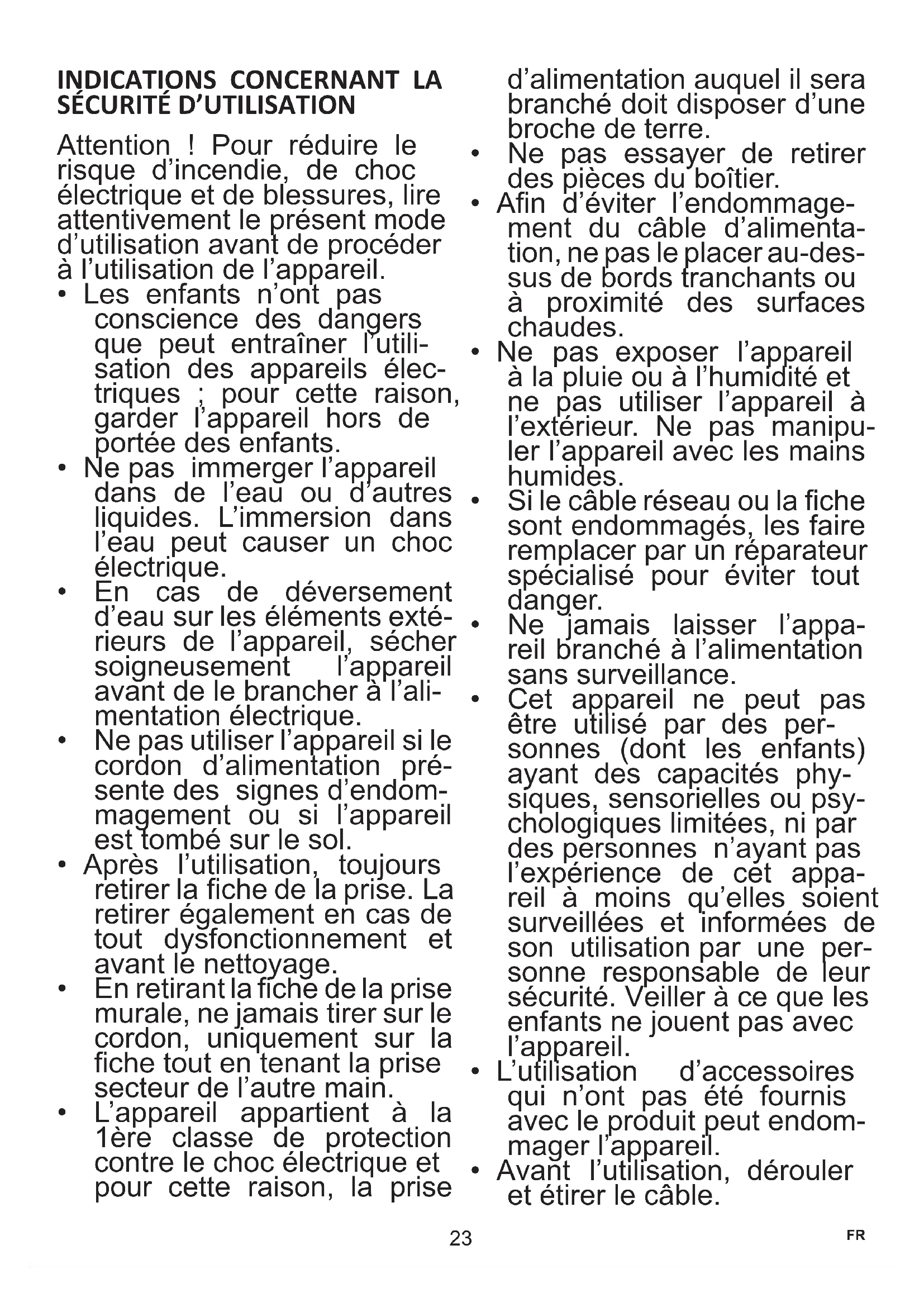Attention ! Pour réduire le risque d’incendie, de choc électrique et de blessures, lire attentivement le présent mode d’utilisation avant de procéder à l’utilisation de l’appareil.