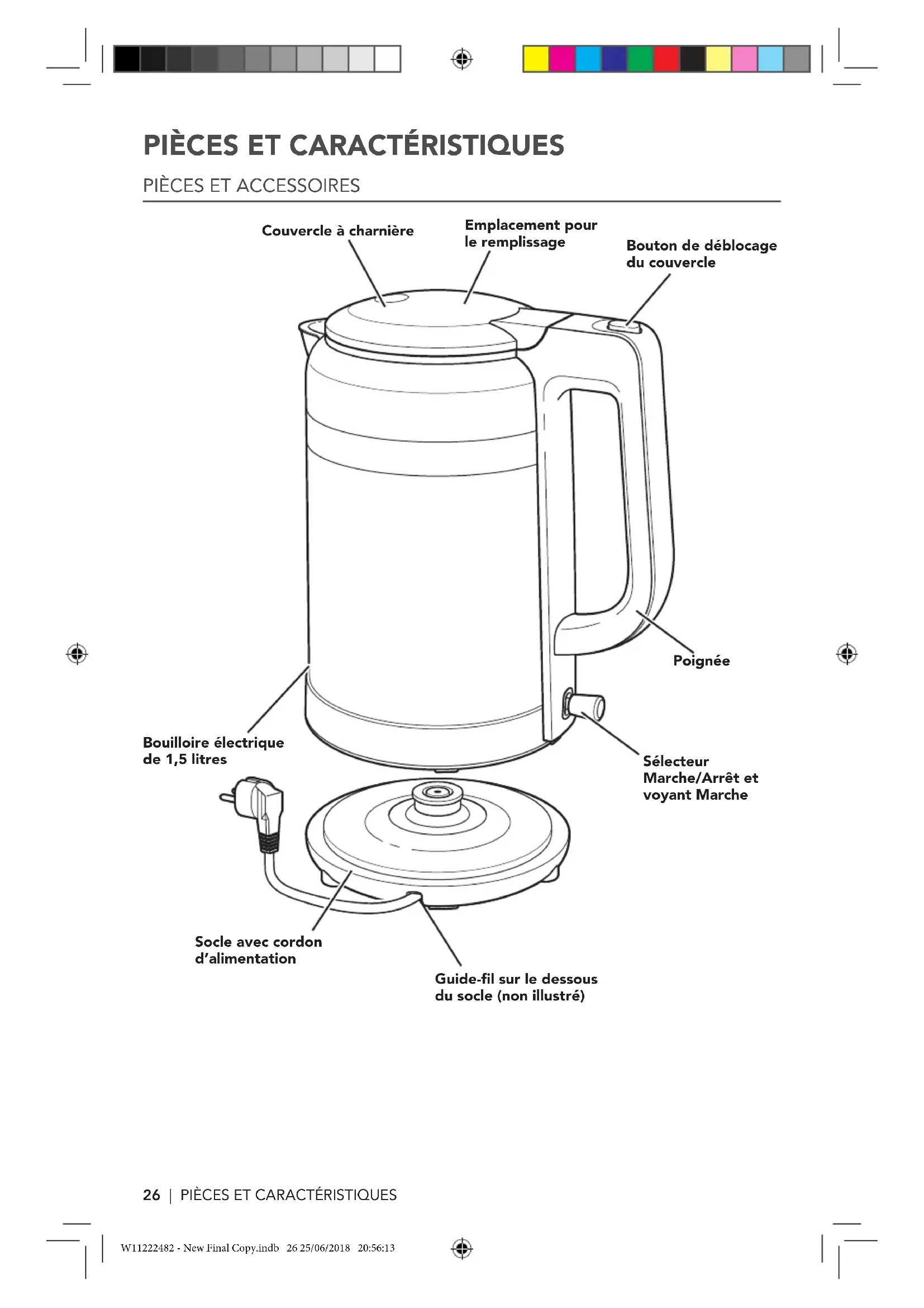 Emplacement pour le remplissage Bouton de déblocage du couvercle Couvercle à charnière Socle avec cordon d’alimentation Sélecteur Marche/Arrêt et voyant Marche Poignée Bouilloire électrique de 1,5litres Guide-fil sur le dessous dusocle (non illustré) W11222482 - New Final Copy.indb 26 25/06/2018 20:56:13FRANÇAIS