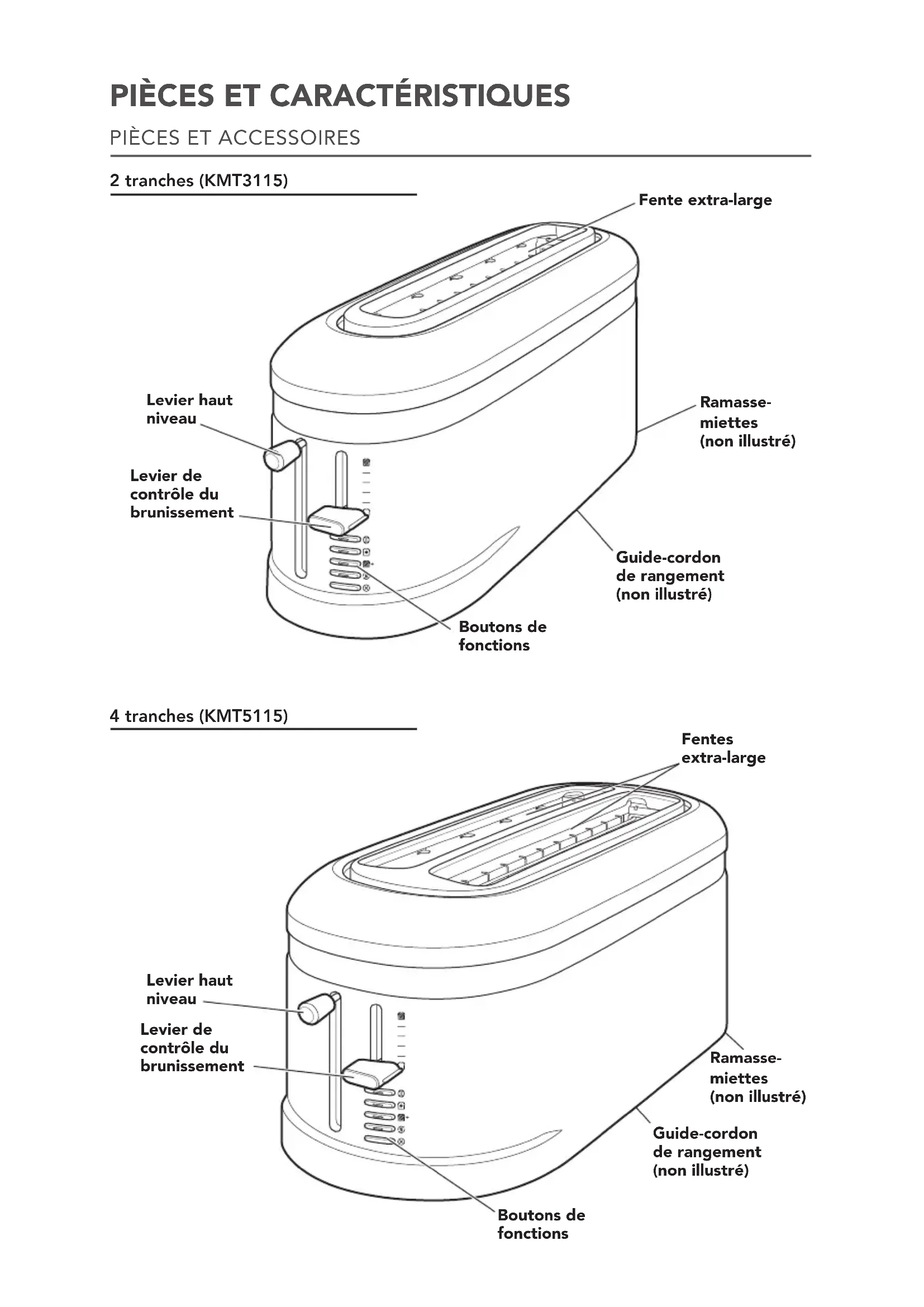 Fente extra-large Levier haut niveau Levier de contrôle du brunissement Ramasse-miettes (non illustré) Guide-cordon de rangement (non illustré) Boutons de fonctions4 tranches (KMT5115)