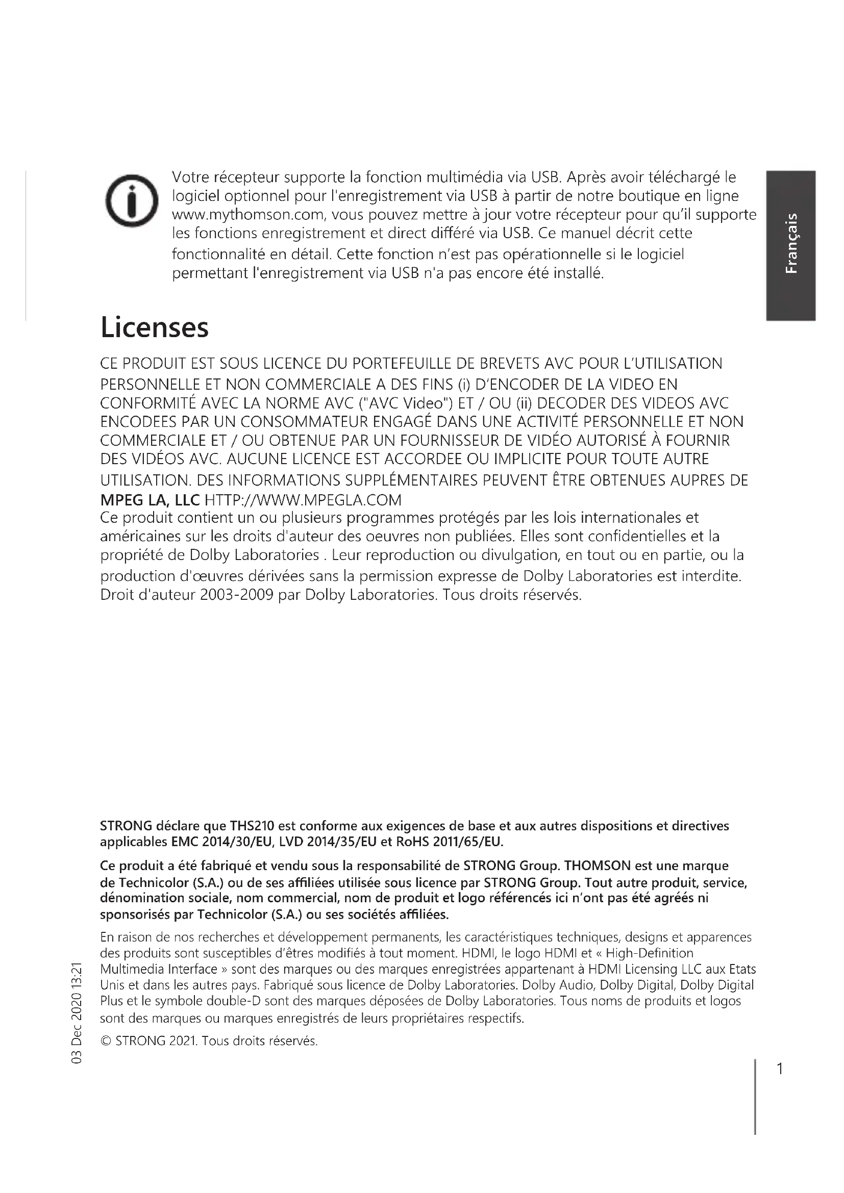 Digital HD Satellite Receiver User Manual Inhaltsverzeichnis Table des matières Indice Índice Manual do Utilizador Uživatelská příručka Používateľská príručka Instrukcja obsługi Upute za korištenje Felhasználói kézikönyv Kullanıcı Kılavuzu Руководство пользователя Посібник користувача THS21003 Dec 2020 13:01 This product has been manufactured and sold under the responsibility of STRONG Group. THOMSON and the THOMSON logo are trademarks of Technicolor (S.A.) or its aliates and are used under license by STRONG Group. Represented by STRONG Ges.m.b.H. Franz-Josefs-Kai 1 1010 Vienna, Austria Email: support_at@thomsonstb.net Any other product, service, company, trade name and logo referenced herein are neither endorsed nor sponsored by Technicolor (S.A.) or its aliates.1 Français Votre récepteur supporte la fonction multimédia via USB. Après avoir téléchargé le logiciel optionnel pour l'enregistrement via USB à partir de notre boutique en ligne www.mythomson.com, vous pouvez mettre à jour votre récepteur pour qu’il supporte les fonctions enregistrement et direct diéré via USB. Ce manuel décrit cette fonctionnalité en détail. Cette fonction n’est pas opérationnelle si le logiciel permettant l'enregistrement via USB n'a pas encore été installé. Licenses CE PRODUIT EST SOUS LICENCE DU PORTEFEUILLE DE BREVETS AVC POUR L’UTILISATION PERSONNELLE ET NON COMMERCIALE A DES FINS (i) D‘ENCODER DE LA VIDEO EN CONFORMITÉ AVEC LA NORME AVC ("AVC Video") ET / OU (ii) DECODER DES VIDEOS AVC ENCODEES PAR UN CONSOMMATEUR ENGAGÉ DANS UNE ACTIVITÉ PERSONNELLE ET NON COMMERCIALE ET / OU OBTENUE PAR UN FOURNISSEUR DE VIDÉO AUTORISÉ À FOURNIR DES VIDÉOS AVC. AUCUNE LICENCE EST ACCORDEE OU IMPLICITE POUR TOUTE AUTRE UTILISATION. DES INFORMATIONS SUPPLÉMENTAIRES PEUVENT ÊTRE OBTENUES AUPRES DE MPEG LA, LLC HTTP://WWW.MPEGLA.COM Ce produit contient un ou plusieurs programmes protégés par les lois internationales et américaines sur les droits d'auteur des oeuvres non publiées. Elles sont condentielles et la propriété de Dolby Laboratories . Leur reproduction ou divulgation, en tout ou en partie, ou la production d'œuvres dérivées sans la permission expresse de Dolby Laboratories est interdite. Droit d'auteur 2003-2009 par Dolby Laboratories. Tous droits réservés. 03 Dec 2020 13:21 STRONG déclare que THS210 est conforme aux exigences de base et aux autres dispositions et directives applicables EMC 2014/30/EU, LVD 2014/35/EU et RoHS 2011/65/EU. Ce produit a été fabriqué et vendu sous la responsabilité de STRONG Group. THOMSON est une marque de Technicolor (S.A.) ou de ses aliées utilisée sous licence par STRONG Group. Tout autre produit, service, dénomination sociale, nom commercial, nom de produit et logo référencés ici n’ont pas été agréés ni sponsorisés par Technicolor (S.A.) ou ses sociétés aliées. En raison de nos recherches et développement permanents, les caractéristiques techniques, designs et apparences des produits sont susceptibles d’êtres modiés à tout moment. HDMI, le logo HDMI et « High-Denition Multimedia Interface » sont des marques ou des marques enregistrées appartenant à HDMI Licensing LLC aux Etats Unis et dans les autres pays. Fabriqué sous licence de Dolby Laboratories. Dolby Audio, Dolby Digital, Dolby Digital Plus et le symbole double-D sont des marques déposées de Dolby Laboratories. Tous noms de produits et logos sont des marques ou marques enregistrés de leurs propriétaires respectifs. © STRONG 2021. Tous droits réservés.2