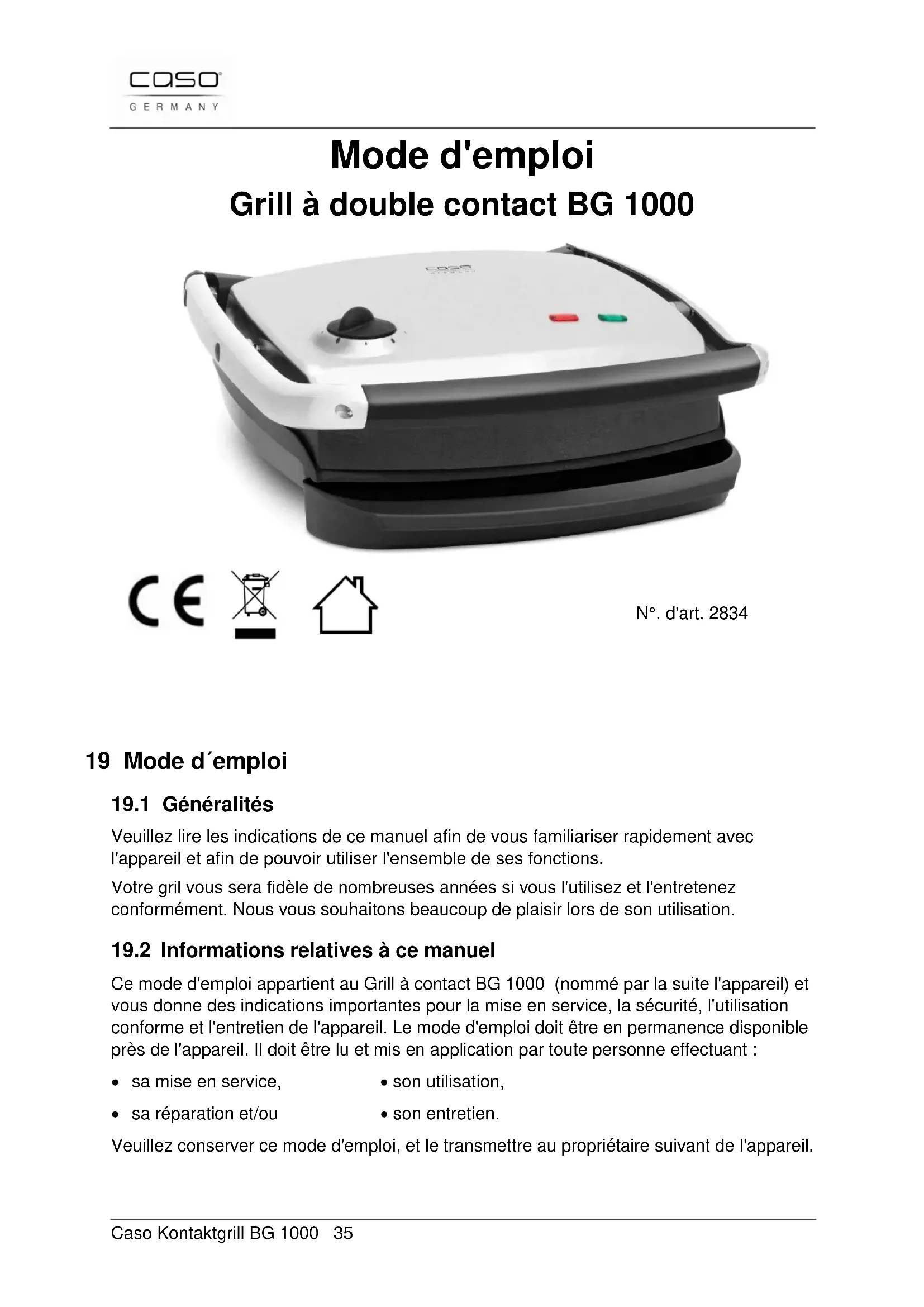 - sa réparation et/ou • son entretien. Veuillez conserver ce mode d'emploi, et le transmettre au propriétaire suivant de l'appareil. N°. d'art. 2834Caso Kontaktgrill BG 1000 36