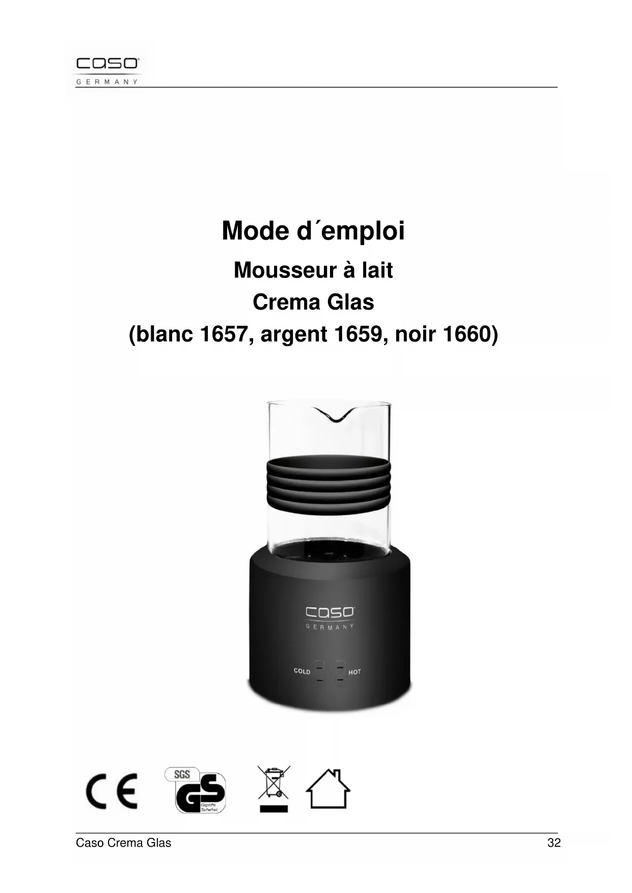 Crema Glas 1657 - Mousseur à lait CASO - Notice d'utilisation et mode d'emploi gratuit