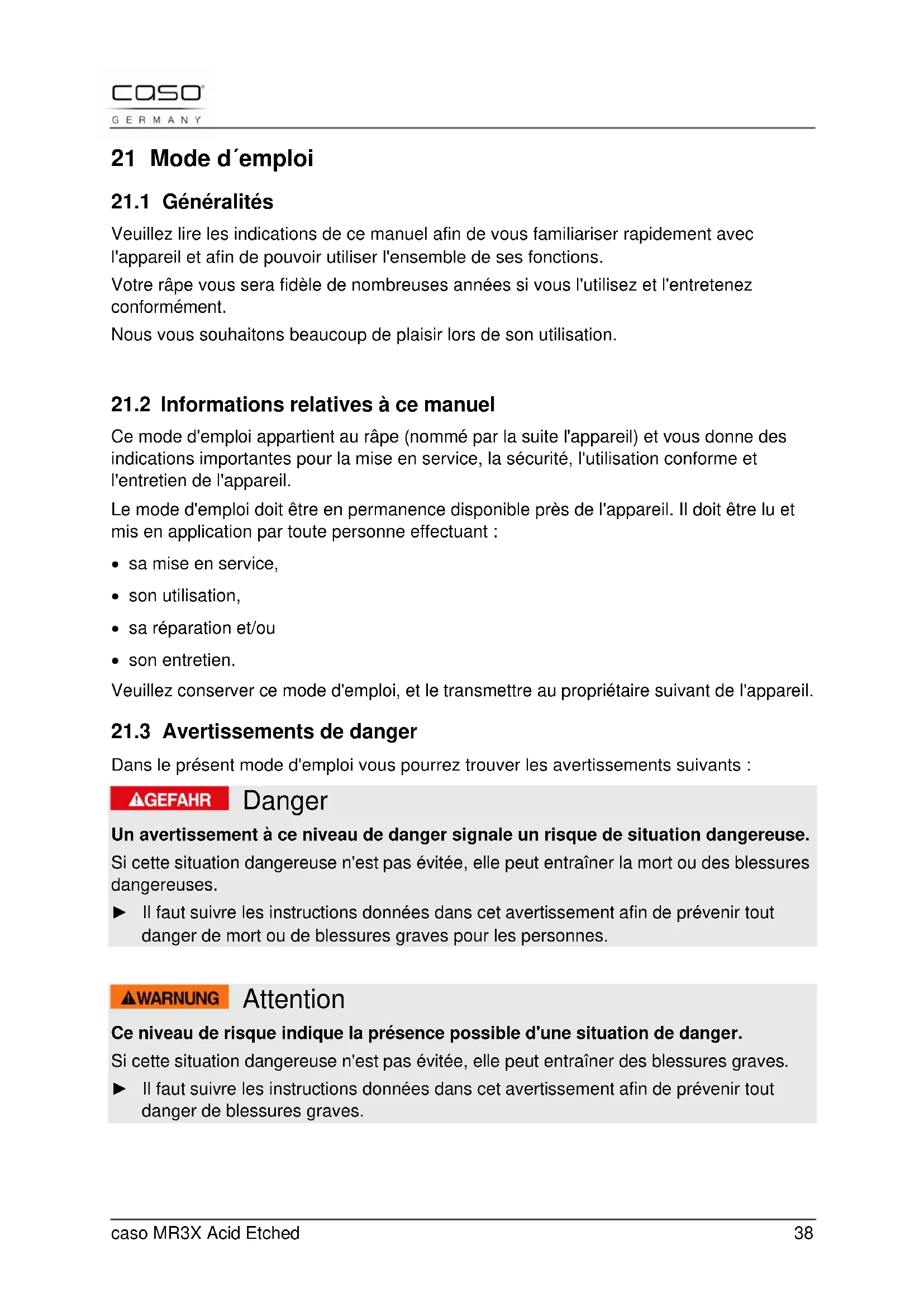 Dans le présent mode d'emploi vous pourrez trouver les avertissements suivants : Danger Un avertissement à ce niveau de danger signale un risque de situation dangereuse. Si cette situation dangereuse n'est pas évitée, elle peut entraîner la mort ou des blessures dangereuses. ► Il faut suivre les instructions données dans cet avertissement afin de prévenir tout danger de mort ou de blessures graves pour les personnes. Attention Ce niveau de risque indique la présence possible d'une situation de danger. Si cette situation dangereuse n'est pas évitée, elle peut entraîner des blessures graves. ► Il faut suivre les instructions données dans cet avertissement afin de prévenir tout danger de blessures graves.caso MR3X Acid Etched 39 Prudence Ce niveau de risque indique la présence possible d'une situation de danger. Si cette situation dangereuse n'est pas évitée, elle peut entraîner des blessures légères ou superficielles. ► Il faut suivre les instructions données dans cet avertissement afin de prévenir les blessures de personnes. Remarque Cette indication est accompagnée d'informations complémentaires pour faciliter l'utilisation de l'appareil.