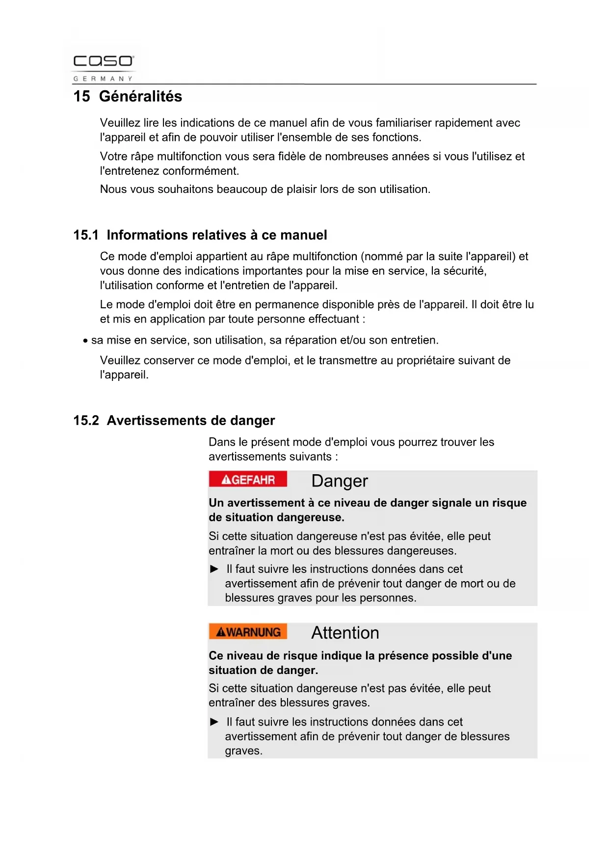 15.2 Avertissements de danger