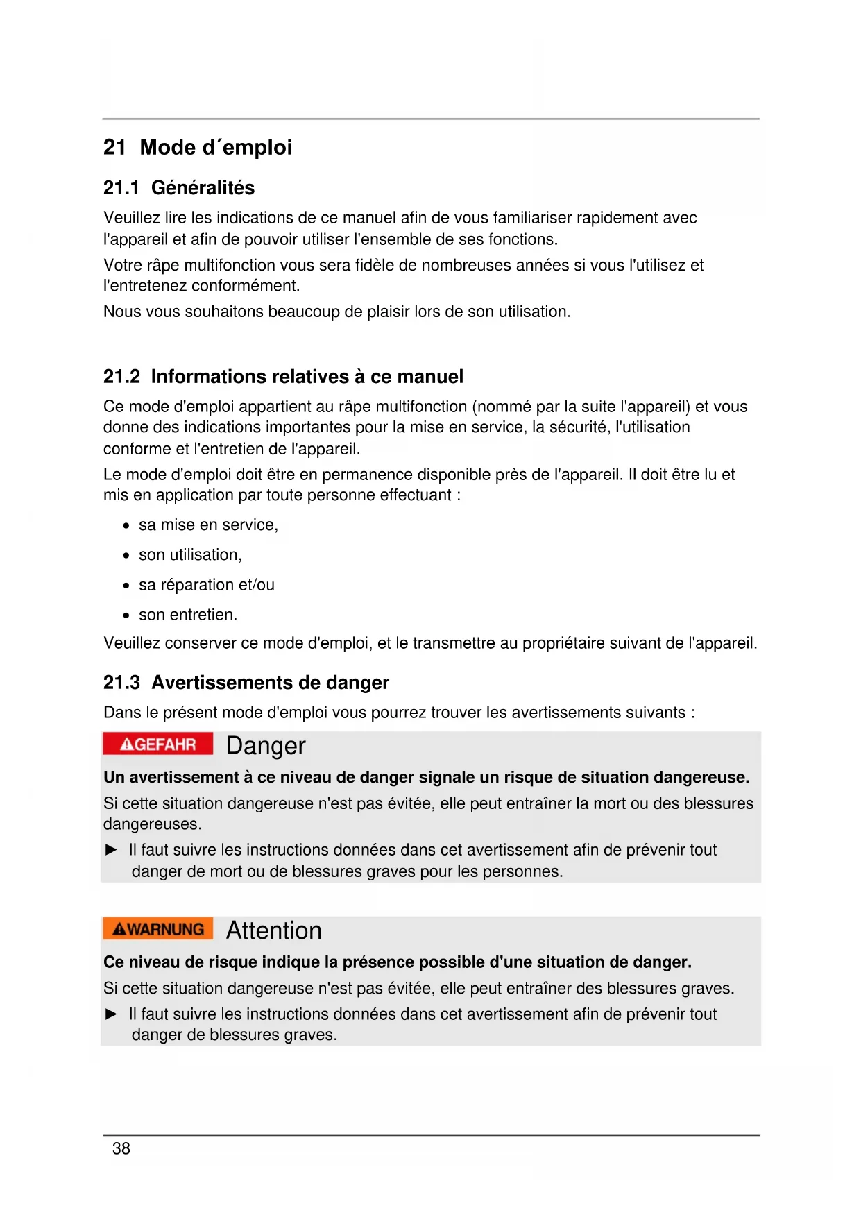 Ce mode d'emploi appartient au râpe multifonction (nommé par la suite l'appareil) et vous donne des indications importantes pour la mise en service, la sécurité, l'utilisation conforme et l'entretien de l'appareil. Le mode d'emploi doit être en permanence disponible près de l'appareil. Il doit être lu et mis en application par toute personne effectuant : sa mise en service, son utilisation, sa réparation et/ou son entretien. Veuillez conserver ce mode d'emploi, et le transmettre au propriétaire suivant de l'appareil.