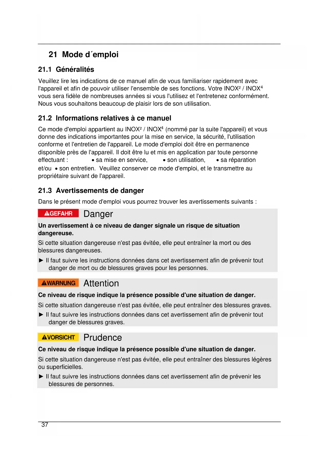 Ce mode d'emploi appartient au INOX² / INOX⁴ (nommé par la suite l'appareil) et vous donne des indications importantes pour la mise en service, la sécurité, l'utilisation conforme et l'entretien de l'appareil. Le mode d'emploi doit être en permanence disponible près de l'appareil. Il doit être lu et mis en application par toute personne effectuant : • sa mise en service, • son utilisation, • sa réparation et/ou • son entretien. Veuillez conserver ce mode d'emploi, et le transmettre au propriétaire suivant de l'appareil.