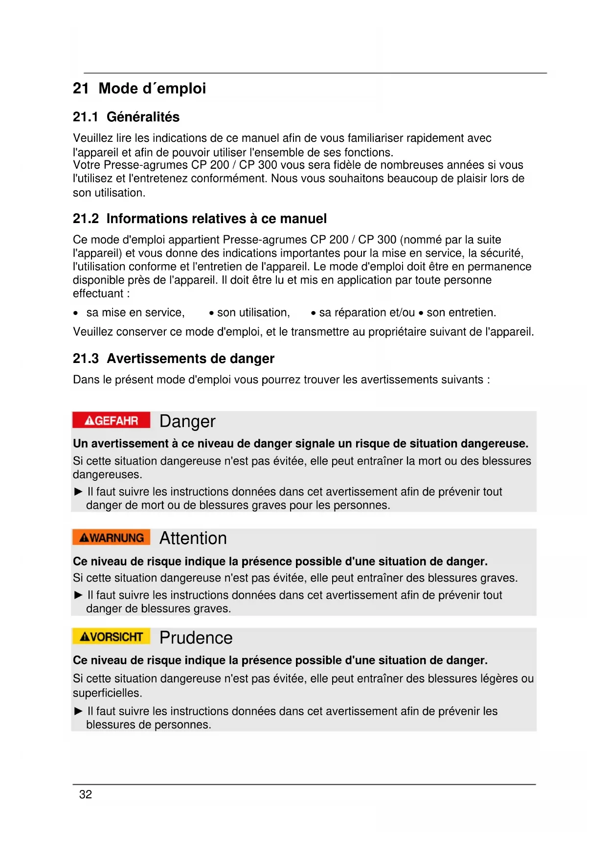 Ce mode d'emploi appartient Presse-agrumes CP 200 / CP 300 (nommé par la suite l'appareil) et vous donne des indications importantes pour la mise en service, la sécurité, l'utilisation conforme et l'entretien de l'appareil. Le mode d'emploi doit être en permanence disponible près de l'appareil. Il doit être lu et mis en application par toute personne effectuant :